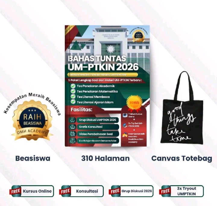 BELI DI TIKTOK DI SHOPEE Buku “Bahas Tuntas UM-PTKIN 2026” Buku “Bahas Tuntas UM-PTKIN 2026” merupakan panduan persiapan intensif bagi calon mahasiswa yang ingin menempuh pendidikan di Perguruan Tinggi Keagamaan Islam Negeri (PTKIN) melalui jalur Ujian Masuk (UM). Buku ini diterbitkan oleh DMH Academy sebagai bagian dari program “Raih Beasiswa” untuk membantu peserta meraih skor tinggi dalam seleksi. Info Belanja Cicilan Online Murah Motor HP Laptop TV Mesin Cuci Kompor Gas Springbed Dll Isi dan Materi Utama Buku setebal 310 halaman ini memuat 5 paket lengkap soal dan materi terbaru yang disesuaikan dengan standar ujian UM-PTKIN tahun 2026. Materi yang dibahas meliputi empat subtes utama: Tes Penalaran Akademik: Menguji kemampuan kognitif dan logika dasar. Tes Penalaran Matematika: Berfokus pada kemampuan kuantitatif dan penyelesaian masalah numerik. Tes Literasi Membaca: Melatih pemahaman teks dan analisis bacaan. Tes Literasi Ajaran Islam: Materi khusus mengenai pemahaman nilai dan ajaran Islam. Fasilitas dan Bonus Pembelian Setiap pembelian buku ini biasanya dilengkapi dengan berbagai fasilitas pendukung untuk memaksimalkan proses belajar, di antaranya: Akses Digital: Video pembahasan soal yang mendalam serta live belajar via platform online (Zoom) bersama tutor ahli. Latihan Ujian: Fasilitas 3x Try Out UM-PTKIN untuk simulasi ujian yang sesungguhnya. Pendampingan: Grup diskusi khusus untuk angkatan 2026 dan layanan konsultasi gratis. Merchandise: Bonus berupa canvas totebag eksklusif dengan desain motivasi. Beli Buku “Bahas Tuntas UM-PTKIN 2026” di TIKTOK atau di SHOPEE Buku ini dipasarkan sebagai solusi “all-in-one” bagi pejuang PTKIN agar dapat menguasai materi tanpa perlu mengeluarkan biaya bimbingan belajar yang mahal. Navigasi pos Filosofi Teras : Filsafat Yunani-Romawi Kuno untuk Mental Tangguh Masa Kini IKIGAI Rahasia Hidup Bahagia dan Panjang Umur Orang Jepang