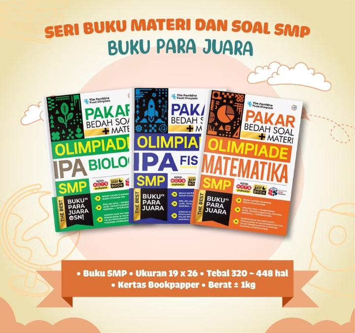 Buku OSN SD SMP SMA 2026 Persiapan menghadapi Olimpiade Sains Nasional (OSN) 2026 memerlukan strategi yang matang, dimulai dari pemilihan materi belajar yang tepat sesuai dengan panduan resmi dari Pusat Prestasi Nasional (Puspresnas). Berikut adalah panduan memilih buku dan materi persiapan OSN 2026 untuk semua jenjang. Bidang Lomba dan Materi Utama Setiap jenjang memiliki fokus bidang lomba yang berbeda sesuai dengan kurikulum yang berlaku: SD/MI: Matematika dan Ilmu Pengetahuan Alam (IPA). SMP/MTs: Matematika, IPA, dan Ilmu Pengetahuan Sosial (IPS). SMA/MA: Sembilan bidang lomba mencakup Matematika, Fisika, Kimia, Biologi, Informatika/ Komputer, Astronomi, Ekonomi, Kebumian, dan Geografi. Rekomendasi Buku OSN 2026 Gunakan buku yang mengacu pada silabus terbaru 2026 untuk memastikan materi yang dipelajari relevan. BUKU KSN OSN SD 2026 : MATEMATIKA DAN SAINS BELI DI SHOPEE Info Belanja Cicilan Online Murah Motor HP Laptop TV Mesin Cuci Kompor Gas Kasur Springbed Dll BUKU KSN OSN SMP 2026 : MATEMATIKA IPA FISIK IPA BIOLOGI BELI DI SHOPEE BUKU KSN OSN SMA 2026 : MATEMATIKA FISIKA KIMIA BIOLOGI BELI DI SHOPEE | BELI DI TIKTOK *** Navigasi pos Buku Paten Sekolah Kedinasan 2026 – Kuliah Gratis dan Lulus Auto Jadi PNS Buku TKA SD SMP SMA 2026