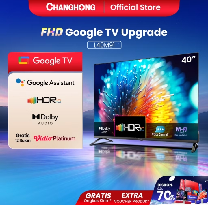 Rp266.000 per bulan – Changhong Google TV 40″ FHD Dolby Audio Google Play Netflix Youtube Bluetooth USB Google Assistant Smart TV Digital TV Free Vidio (L40M91) Rp3.139.000.