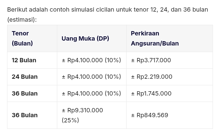 10 HP Termahal Yamaha XSR 155: Motor Retro Modern Paling Hits, Segini Harga dan Skema Kreditnya Yamaha XSR 155 mengusung konsep Sport Heritage yang menggabungkan tampilan klasik tahun 80-an dengan teknologi mesin modern. Motor ini sangat diminati oleh mereka yang menyukai gaya custom tanpa harus repot memodifikasi sendiri. Spesifikasi & Fitur Utama Mesin: Menggunakan mesin 155cc, SOHC, 4 langkah, berpendingin cairan dengan teknologi VVA (Variable Valve Actuation) yang membuat tenaga tetap optimal di setiap putaran mesin. Performa: Menghasilkan tenaga maksimum 19 Tk pada 10.000 rpm dan torsi 14,7 Nm pada 8.500 rpm. Transmisi: Dilengkapi fitur Assist & Slipper Clutch agar tarikan kopling lebih ringan dan perpindahan gigi lebih halus. Desain: Lampu depan dan belakang sudah LED dengan model bulat yang klasik, serta panel instrumen digital full LCD. Dimensi: Tinggi tempat duduk mencapai 810 mm dengan kapasitas tangki bensin 10,4 liter. Yamaha XSR 155 Info Belanja Cicilan Online Murah Motor HP Laptop TV Mesin Cuci Kompor Gas Springbed Dll Harga & Simulasi Cicilan Berdasarkan data terbaru dari BSI OTO, harga OTR (On The Road) Yamaha XSR 155 berada di kisaran Rp41.030.000. Catatan: Angka di atas merupakan simulasi. Untuk perhitungan akurat sesuai wilayah Anda, silakan cek langsung di dealer resmi melalui Situs Resmi Yamaha Indonesia. Navigasi pos TECNO POVA Curve 5G : Main Game Makin Gacor! dengan Performa Dimensity 7300 Ultimate Daihatsu New Sigra 2026 : Daftar Harga, Spesifikasi dan Simulasi Cicilan