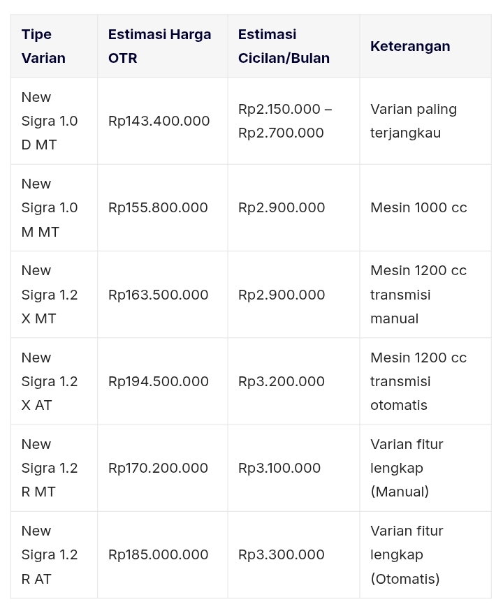 Daihatsu New Sigra tetap menjadi primadona di segmen Low Cost Green Car (LCGC) berkat kombinasi harga yang sangat kompetitif, kabin yang lega untuk tujuh penumpang, dan efisiensi bahan bakar yang tinggi. Mobil ini sangat cocok bagi keluarga muda atau pengemudi transportasi daring yang mencari kendaraan fungsional dengan biaya operasional rendah.