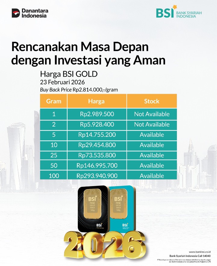 Emas Dunia Antam BSI Gold Galeri 24 Emasku Lotus Archi Grafik Cicil Harga BSI Gold Hari Ini BSI Gold adalah produk investasi emas batangan fisik hasil kolaborasi Bank Syariah Indonesia dan PT Hartadinata Abadi. Emas ini berstandar SNI, tersertifikasi syariah MUI, memiliki fitur keamanan anti-pemalsuan, dan dapat diperoleh melalui cicil emas di aplikasi BYOND atau cabang BSI. BSI Gold menawarkan solusi investasi aman dengan likuiditas tinggi. Hari ini BSI Gold harganya berapa? Harganya ada di bawah ya. Beli emas BSI Gold di kantor cabang BSI atau di aplikasi BYOND BSI. Info Belanja Cicilan Online Murah Motor HP Laptop TV Mesin Cuci Kompor Gas Springbed Dll Harga Emas BSI Gold Tanggal 26 Februari 2026 Harga Emas BSI Gold Tanggal 25 Februari 2026 Harga Emas BSI Gold Tanggal 24 Februari 2026 Harga Emas BSI Gold Tanggal 23 Februari 2026 Harga Emas BSI Gold Tanggal 22 Februari 2026 Harga : Rp2.985.000 Buy Back : Rp2.845.000 Sumber : BYOND BSI Waktu : 07:33 Harga Emas BSI Gold Tanggal 21 Februari 2026 Harga : Rp2.935.000 Buy Back : Rp2.800.000 Sumber : BYOND BSI Waktu : 07:33 Harga Emas BSI Gold Tanggal 20 Februari 2026 Harga Emas BSI Gold Tanggal 19 Februari 2026 Harga BSI Gold (17 Februari 2026) Harga : Rp2.925.000 Buy Back : Rp2.785.000 Sumber : BYOND BSI Harga BSI Gold (16 Februari 2026) Harga : Rp2.935.000 Buy Back : Rp2.785.000 Sumber : BYOND BSI hrtagold Navigasi pos Investasi Emas : 7 Produk Emas Batangan yang Dijual di Indonesia Grafik Harga Emas Hari Ini