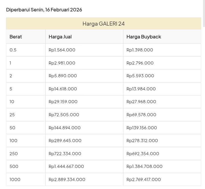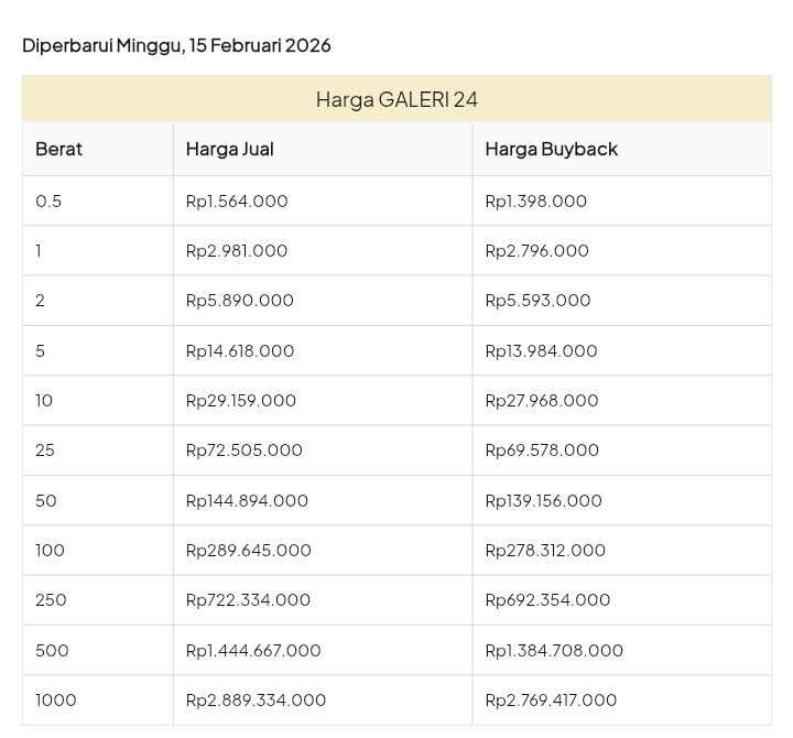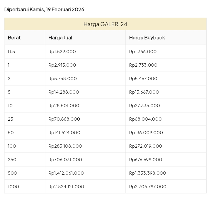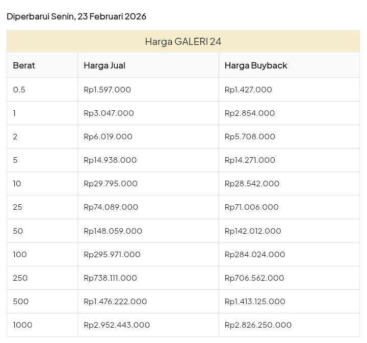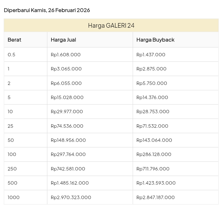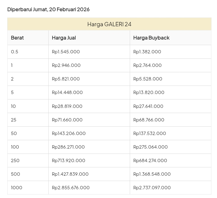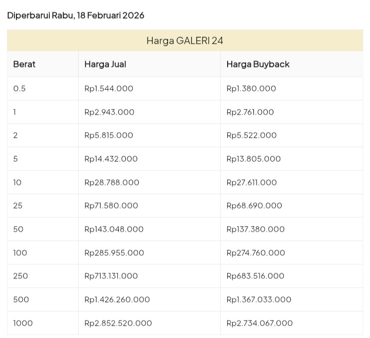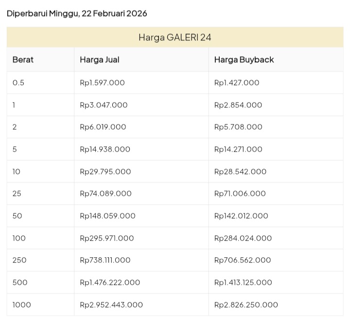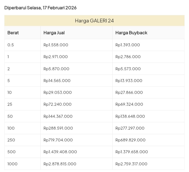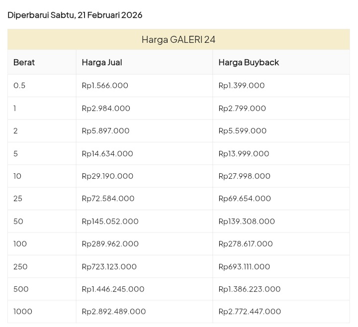Emas Dunia Antam BSI Gold Galeri 24 Emasku Lotus Archi Grafik Cicil Harga Emas Galeri 24 Hari Ini Galeri 24 adalah Perusahaan industri manufaktur dan retail yang bergerak dalam bidang layanan jasa pemurnian, produksi dan retail emas serta perhiasan yang juga merupakan anak perusahaan PT Pegadaian. Emas Galeri 24 hari ini harganya berapa? Harganya ada di bawah ya. Beli emas Galeri 24 di sini Info Belanja Cicilan Online Murah Motor HP Laptop TV Mesin Cuci Kompor Gas Springbed Dll Harga Emas Galeri 25 Tanggal 26 Februari 2026 Harga Emas Galeri 25 Tanggal 25 Februari 2026 Harga Emas Galeri 24 Tanggal 24 Februari 2026 Harga Emas Galeri 24 Tanggal 23 Februari 2026 Harga Emas Galeri 24 Tanggal 22 Februari 2026 Harga Emas Galeri 24 Tanggal 21 Februari 2026 Harga Emas Galeri 24 Tanggal 20 Februari 2026 galeri24 Navigasi pos Harga EMASKU Hartadinata Hari Ini Cicil Emas di BCA Syariah Bisa 1 Miliar