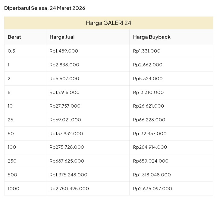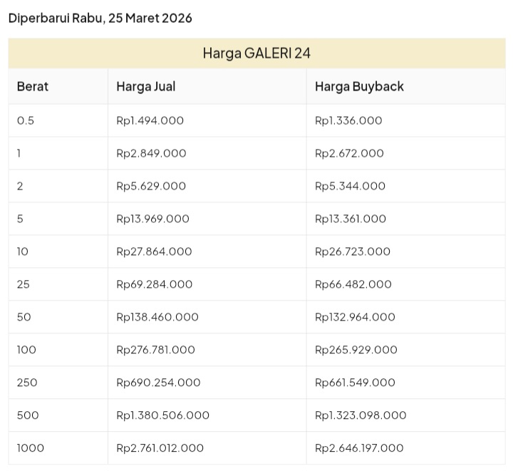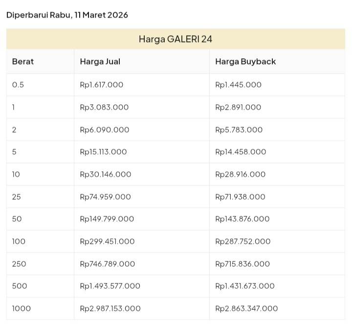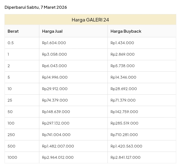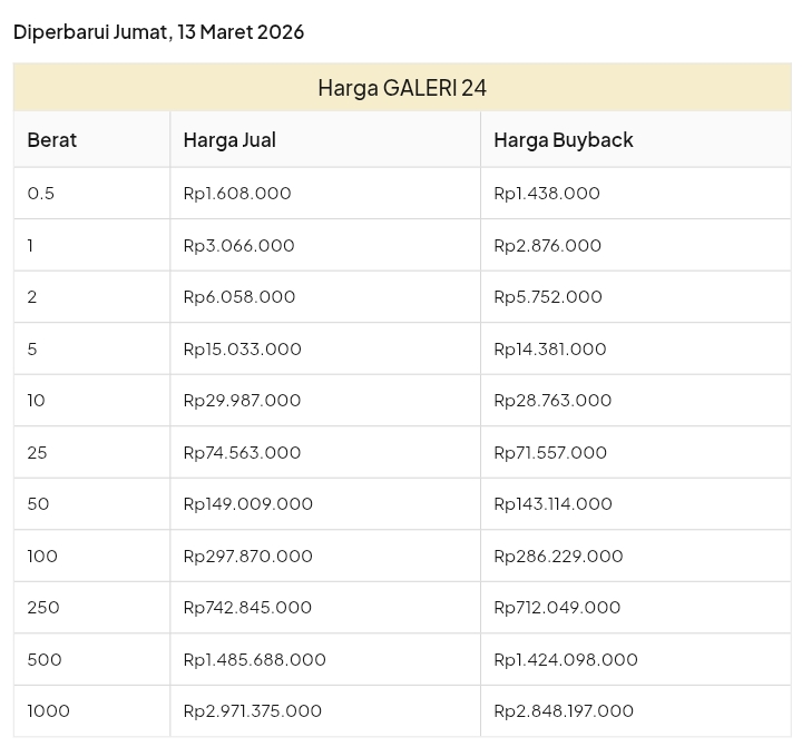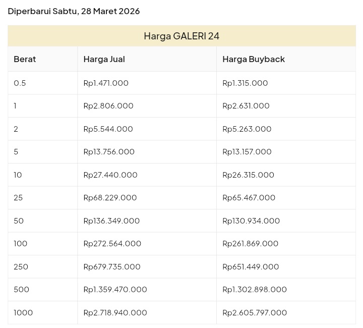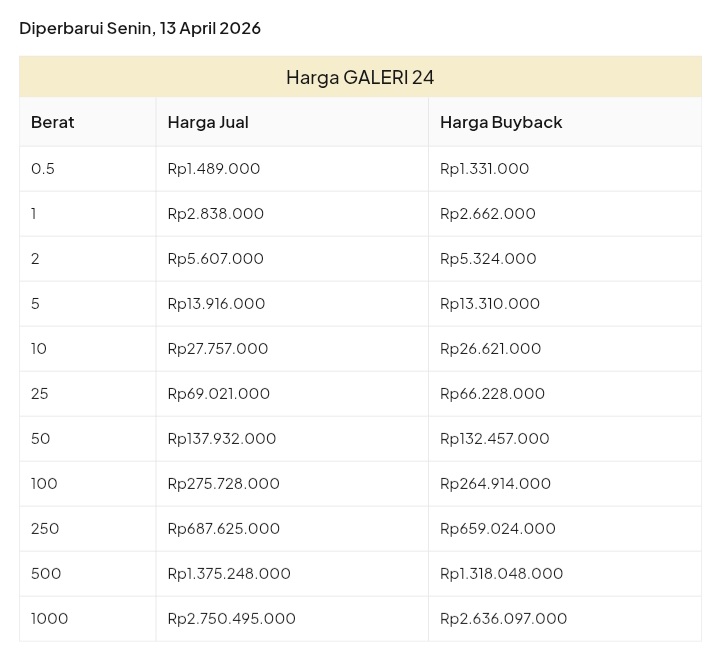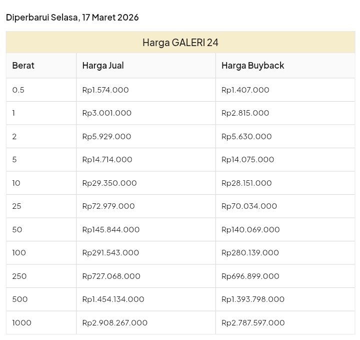 Emas Dunia Antam BSI Gold Galeri 24 Emasku Lotus Archi Grafik Cicil Harga Emas Galeri 24 Pegadaian Hari Ini Galeri 24 adalah Perusahaan industri manufaktur dan retail yang bergerak dalam bidang layanan jasa pemurnian, produksi dan retail emas serta perhiasan yang juga merupakan anak perusahaan PT Pegadaian. Emas Galeri 24 hari ini harganya berapa? Harganya ada di bawah ya. Beli emas Galeri 24 di sini Info Belanja Cicilan Online Murah Motor HP Laptop TV Mesin Cuci Kompor Gas Springbed Dll Harga Emas Galeri 24 Pegadaian Tanggal 13 April 2026 Harga Emas Galeri 24 Pegadaian Tanggal 7 April 2026 Harga Emas Galeri 24 Pegadaian Tanggal 3 April 2026 Harga Emas Galeri 24 Pegadaian Tanggal 28 Maret 2026 Harga Emas Galeri 24 Pegadaian Tanggal 27 Maret 2026 Harga Emas Galeri 24 Pegadaian Tanggal 26 Maret 2026 Harga Emas Galeri 24 Pegadaian Tanggal 25 Maret 2026 Harga Emas Galeri 24 Pegadaian Tanggal 24 Maret 2026 Harga Emas Galeri 24 Pegadaian Tanggal 20 Maret 2026 Harga Emas Galeri 24 Pegadaian Tanggal 19 Maret 2026 Harga Emas Galeri 24 Tanggal 18 Maret 2026 Harga Emas Galeri 24 Tanggal 17 Maret 2026 Harga Emas Galeri 24 Tanggal 16 Maret 2026 Harga Emas Galeri 24 Tanggal 15 Maret 2026 Harga Emas Galeri 24 Tanggal 14 Maret 2026 Harga Emas Galeri 24 Tanggal 13 Maret 2026 Harga Emas Galeri 24 Tanggal 12 Maret 2026 Harga Emas Galeri 24 Tanggal 11 Maret 2026 Harga Emas Galeri 24 Tanggal 10 Maret 2026 Harga Emas Galeri 24 Tanggal 9 Maret 2026 Harga Emas Galeri 24 Tanggal 8 Maret 2026 Harga Emas Galeri 24 Tanggal 7 Maret 2026 Harga Emas Galeri 24 Tanggal 6 Maret 2026 Harga Emas Galeri 24 Tanggal 5 Maret 2026 Harga Emas Galeri 24 Tanggal 4 Maret 2026 Harga Emas Galeri 24 Tanggal 3 Maret 2026 Harga Emas Galeri 24 Tanggal 2 Maret 2026 Harga Emas Galeri 24 Tanggal 1 Maret 2026 Harga Emas Galeri 24 Tanggal 28 Februari 2026 Harga Emas Galeri 24 Tanggal 27 Februari 2026 Harga Emas Galeri 24 Tanggal 26 Februari 2026 Harga Emas Galeri 24 Tanggal 25 Februari 2026 Harga Emas Galeri 24 Tanggal 24 Februari 2026 Harga Emas Galeri 24 Tanggal 23 Februari 2026 Harga Emas Galeri 24 Tanggal 22 Februari 2026 Harga Emas Galeri 24 Tanggal 21 Februari 2026 Harga Emas Galeri 24 Tanggal 20 Februari 2026 galeri24 Navigasi pos Harga EMASKU Hartadinata Hari Ini Cicil Emas di BCA Syariah Bisa 1 Miliar