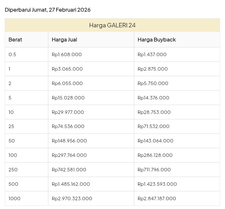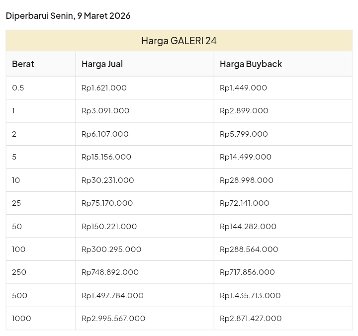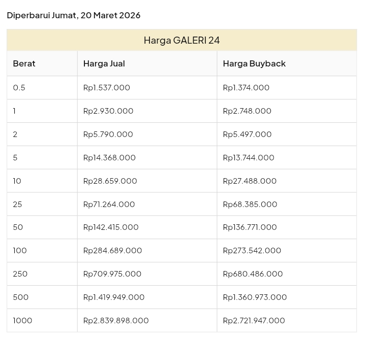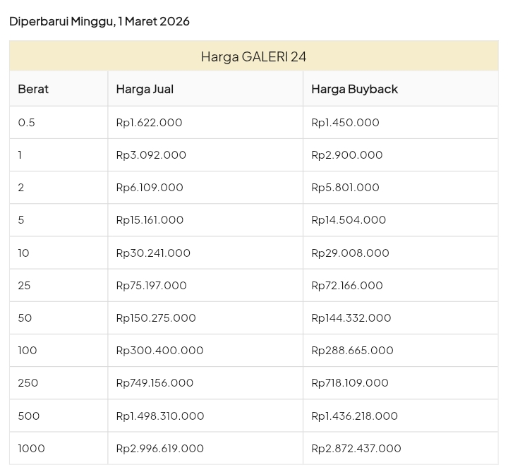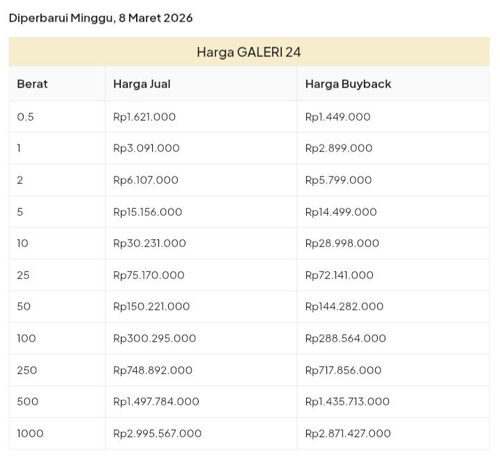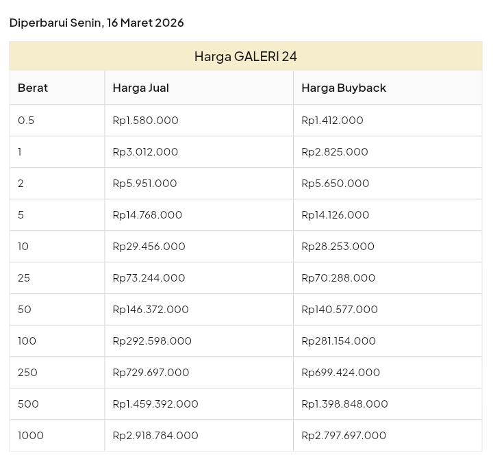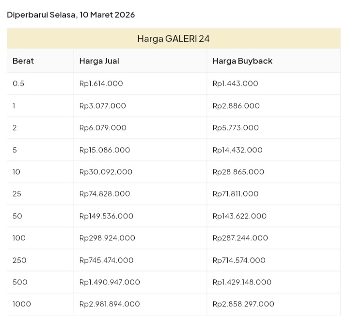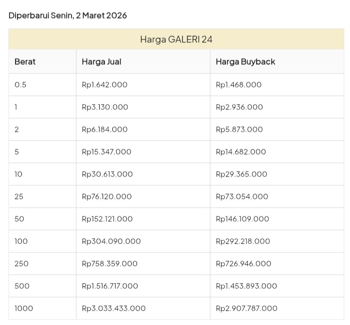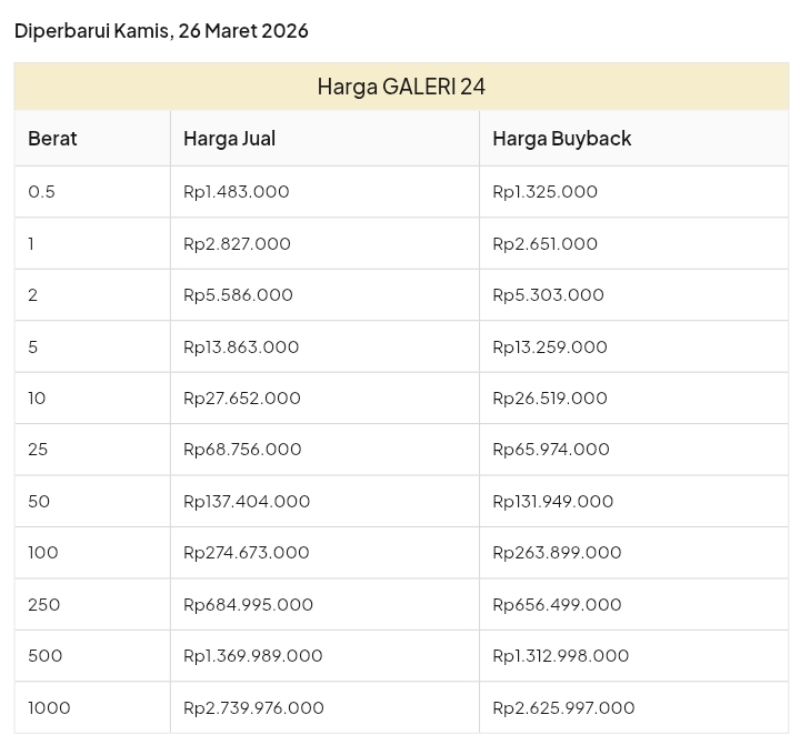 Emas Dunia Antam BSI Gold Galeri 24 Emasku Lotus Archi Grafik Cicil Harga Emas Galeri 24 Pegadaian Hari Ini Galeri 24 adalah Perusahaan industri manufaktur dan retail yang bergerak dalam bidang layanan jasa pemurnian, produksi dan retail emas serta perhiasan yang juga merupakan anak perusahaan PT Pegadaian. Emas Galeri 24 hari ini harganya berapa? Harganya ada di bawah ya. Beli emas Galeri 24 di sini Info Belanja Cicilan Online Murah Motor HP Laptop TV Mesin Cuci Kompor Gas Springbed Dll Harga Emas Galeri 24 Pegadaian Tanggal 13 April 2026 Harga Emas Galeri 24 Pegadaian Tanggal 7 April 2026 Harga Emas Galeri 24 Pegadaian Tanggal 3 April 2026 Harga Emas Galeri 24 Pegadaian Tanggal 28 Maret 2026 Harga Emas Galeri 24 Pegadaian Tanggal 27 Maret 2026 Harga Emas Galeri 24 Pegadaian Tanggal 26 Maret 2026 Harga Emas Galeri 24 Pegadaian Tanggal 25 Maret 2026 Harga Emas Galeri 24 Pegadaian Tanggal 24 Maret 2026 Harga Emas Galeri 24 Pegadaian Tanggal 20 Maret 2026 Harga Emas Galeri 24 Pegadaian Tanggal 19 Maret 2026 Harga Emas Galeri 24 Tanggal 18 Maret 2026 Harga Emas Galeri 24 Tanggal 17 Maret 2026 Harga Emas Galeri 24 Tanggal 16 Maret 2026 Harga Emas Galeri 24 Tanggal 15 Maret 2026 Harga Emas Galeri 24 Tanggal 14 Maret 2026 Harga Emas Galeri 24 Tanggal 13 Maret 2026 Harga Emas Galeri 24 Tanggal 12 Maret 2026 Harga Emas Galeri 24 Tanggal 11 Maret 2026 Harga Emas Galeri 24 Tanggal 10 Maret 2026 Harga Emas Galeri 24 Tanggal 9 Maret 2026 Harga Emas Galeri 24 Tanggal 8 Maret 2026 Harga Emas Galeri 24 Tanggal 7 Maret 2026 Harga Emas Galeri 24 Tanggal 6 Maret 2026 Harga Emas Galeri 24 Tanggal 5 Maret 2026 Harga Emas Galeri 24 Tanggal 4 Maret 2026 Harga Emas Galeri 24 Tanggal 3 Maret 2026 Harga Emas Galeri 24 Tanggal 2 Maret 2026 Harga Emas Galeri 24 Tanggal 1 Maret 2026 Harga Emas Galeri 24 Tanggal 28 Februari 2026 Harga Emas Galeri 24 Tanggal 27 Februari 2026 Harga Emas Galeri 24 Tanggal 26 Februari 2026 Harga Emas Galeri 24 Tanggal 25 Februari 2026 Harga Emas Galeri 24 Tanggal 24 Februari 2026 Harga Emas Galeri 24 Tanggal 23 Februari 2026 Harga Emas Galeri 24 Tanggal 22 Februari 2026 Harga Emas Galeri 24 Tanggal 21 Februari 2026 Harga Emas Galeri 24 Tanggal 20 Februari 2026 galeri24 Navigasi pos Harga EMASKU Hartadinata Hari Ini Cicil Emas di BCA Syariah Bisa 1 Miliar