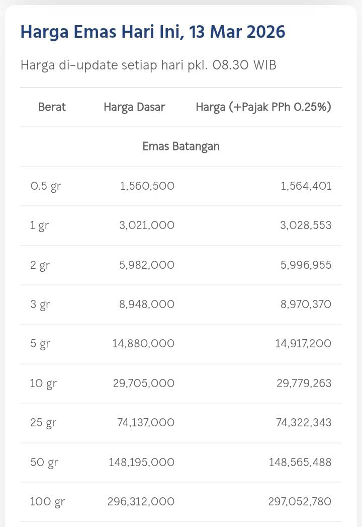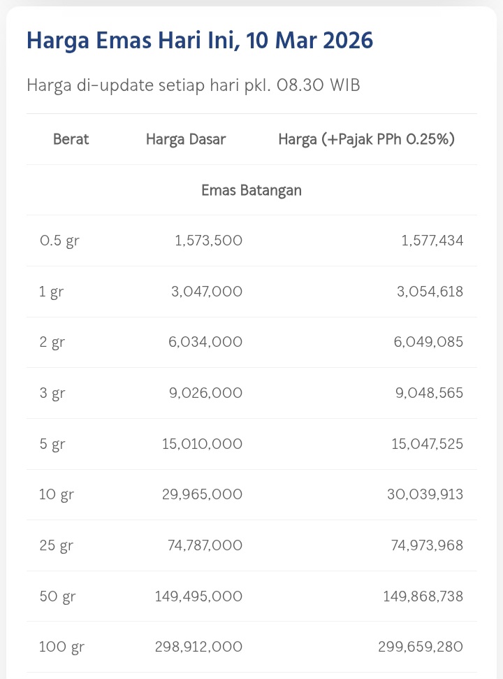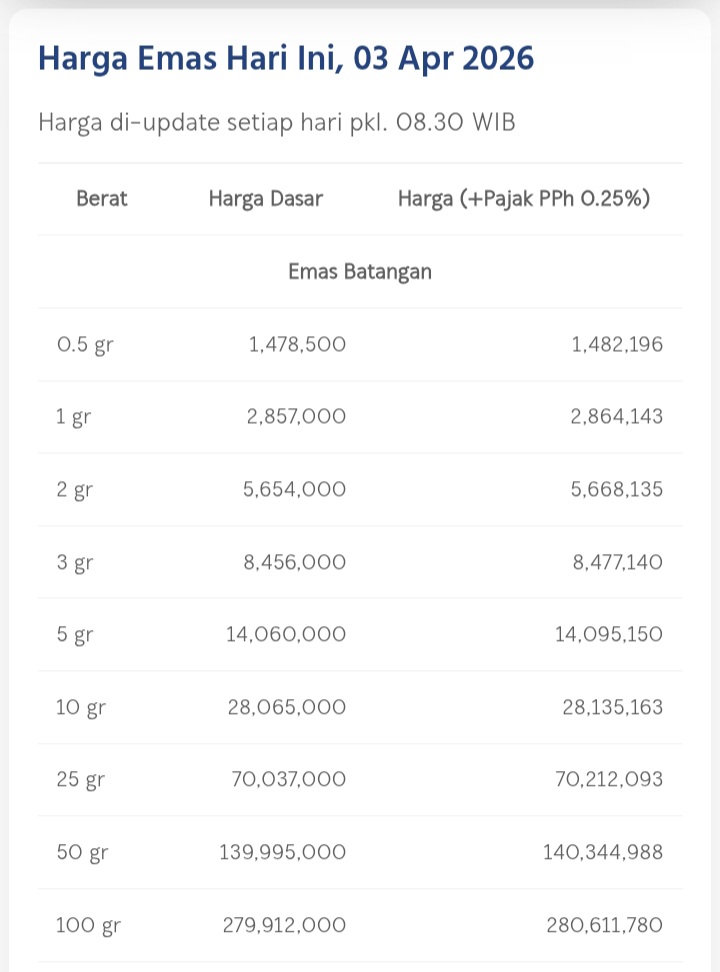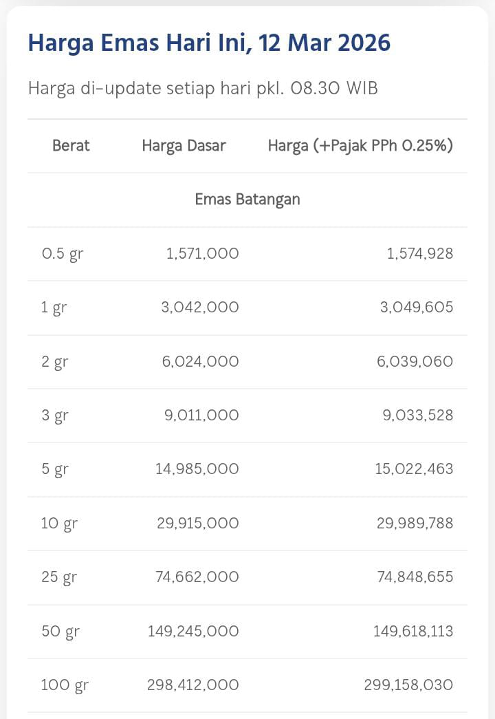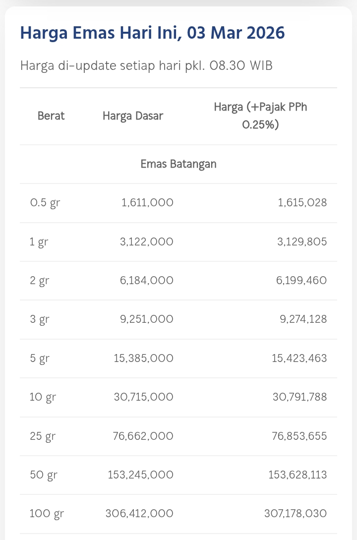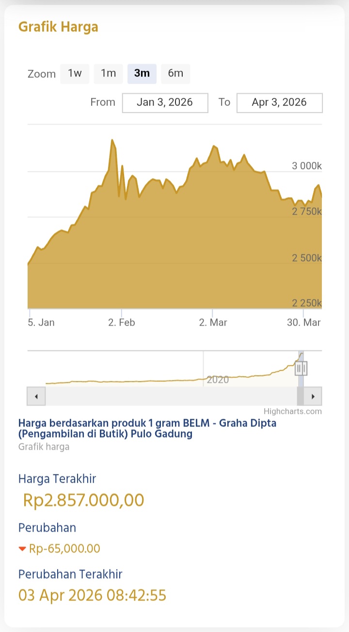 Emas Dunia Antam BSI Gold Galeri 24 Emasku Lotus Archi Grafik Cicil Harga Emas Hari Ini (Logam Mulia Antam) LM Antam (Logam Mulia Antam) adalah produk emas batangan dengan kadar kemurnian 99,99% yang diproduksi oleh PT Aneka Tambang Tbk (Antam). Ini adalah pilihan investasi emas paling populer dan terpercaya di Indonesia. Berapa harga emas Antam hari ini? Harganya ada di bawah ya. Harga emas berubah setiap hari, perubahannya di-update setiap jam 08.30 WIB. Beli emas Antam di sini Info Belanja Terlaris 1 di Shopee! Ini Dia Daftar Produknya Harga Emas Antam Tanggal 3 April 2026 ⬇️ Rp65.000 Harga Emas Antam Tanggal 28 Maret 2026 ⬆️ Rp27.000 Harga Emas Antam Tanggal 27 Maret 2026 ⬇️ Rp40.000 Harga Emas Antam Tanggal 26 Maret 2026 Harga Emas Antam Tanggal 25 Maret 2026 ⬆️ Rp7.000 Harga Emas Antam Tanggal 24 Maret 2026 Harga Emas Antam Tanggal 20 Maret 2026 ⬇️ Rp50.000 Harga Emas Antam Tanggal 19 Maret ⬇️ Rp53.000 Harga Emas Antam Tanggal 18 Maret ⬆️ Rp8.000 Harga Emas Antam Tanggal 17 Maret ⬇️ Rp4.000 Harga Emas Antam Tanggal 16 Maret ⬇️ Rp5.000 Harga Emas Antam Tanggal 14 Maret ⬇️ Rp24.000 Harga Emas Antam Tanggal 13 Maret ⬇️ Rp21.000 Harga Emas Antam Tanggal 12 Maret ⬇️ Rp45.000 Harga Emas Antam Tanggal 11 Maret ⬆️ Rp40.000 Harga Emas Antam Tanggal 10 Maret ⬆️ Rp8.000 Harga Emas Antam Tanggal 9 Maret ⬇️ Rp55.000 Harga Emas Antam Tanggal 7 Maret ⬆️ Rp35.000 Harga Emas Antam Tanggal 6 Maret ⬇️ Rp25.000 Harga Emas Antam Tanggal 5 Maret ⬆️ Rp4.000 Harga Emas Antam Tanggal 4 Maret ⬇️ Rp77.000 Harga Emas Antam Tanggal 3 Maret ⬇️ Rp13.000 Harga Emas Antam Tanggal 2 Maret ⬆️ Rp50.000 Harga Emas Antam Tanggal 28 Februari 2026 ⬆️ Rp40.000 Harga Emas Antam Tanggal 27 Februari 2026 ⬆️ Rp6.000 Harga Emas Antam Tanggal 26 Februari 2026 ⬆️ Rp16.000 Harga Emas Antam Tanggal 25 Februari 2026 ⬇️ Rp45.000 Harga Emas Antam Tanggal 24 Februari 2026 Rp40.000 Harga Emas Antam Tanggal 23 Februari 2026 ⬆️ Rp16.000 Harga Emas Antam Tanggal 21 Februari 2026 Harga Emas Antam Tanggal 20 Februari 2026 Harga Emas Antam Tanggal 19 Februari 2026 Antam Navigasi pos Investasi Perak Harganya Naik 476% dalam 10 Tahun Terakhir Lebih Tinggi dari Emas Cicilan Emas BSI Gold Hari Ini