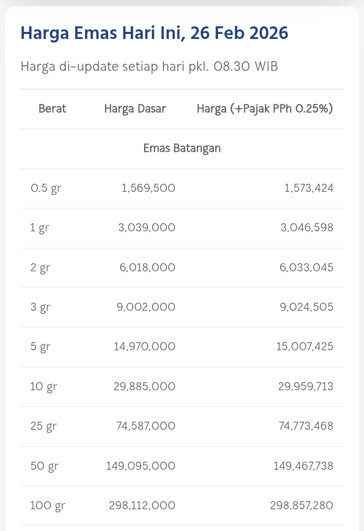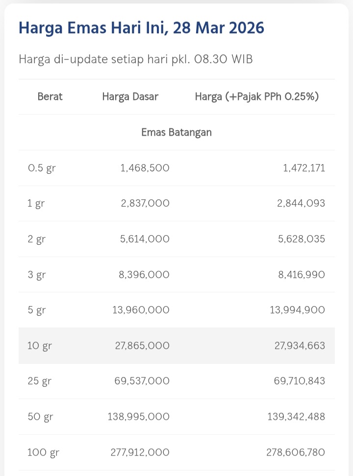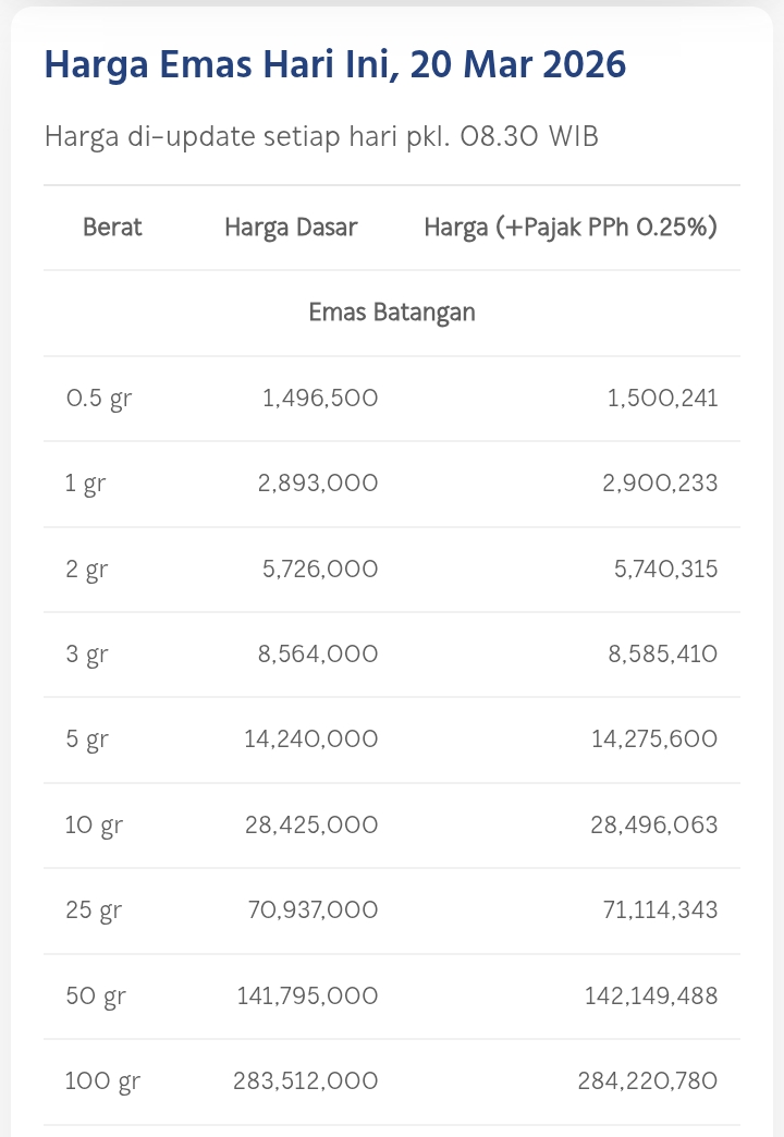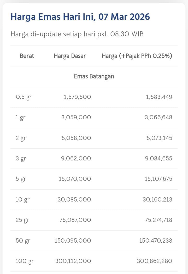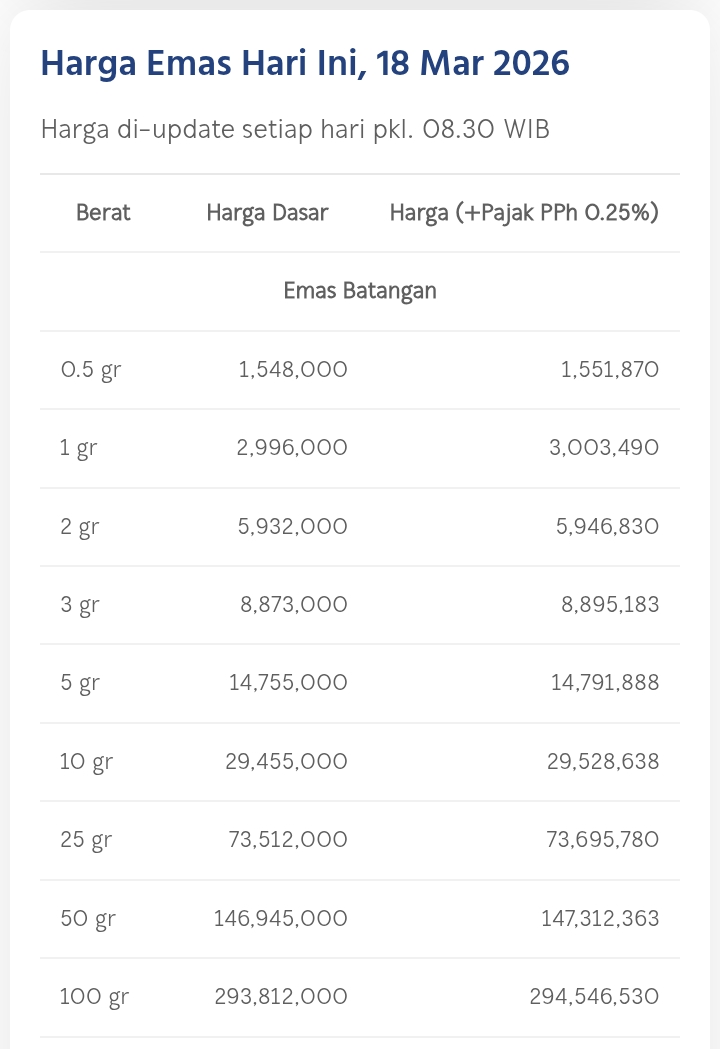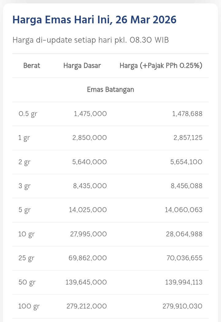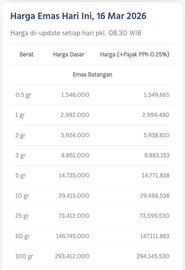 Emas Dunia Antam BSI Gold Galeri 24 Emasku Lotus Archi Grafik Cicil Harga Emas Hari Ini (Logam Mulia Antam) LM Antam (Logam Mulia Antam) adalah produk emas batangan dengan kadar kemurnian 99,99% yang diproduksi oleh PT Aneka Tambang Tbk (Antam). Ini adalah pilihan investasi emas paling populer dan terpercaya di Indonesia. Berapa harga emas Antam hari ini? Harganya ada di bawah ya. Harga emas berubah setiap hari, perubahannya di-update setiap jam 08.30 WIB. Beli emas Antam di sini Info Belanja Terlaris 1 di Shopee! Ini Dia Daftar Produknya Harga Emas Antam Tanggal 3 April 2026 ⬇️ Rp65.000 Harga Emas Antam Tanggal 28 Maret 2026 ⬆️ Rp27.000 Harga Emas Antam Tanggal 27 Maret 2026 ⬇️ Rp40.000 Harga Emas Antam Tanggal 26 Maret 2026 Harga Emas Antam Tanggal 25 Maret 2026 ⬆️ Rp7.000 Harga Emas Antam Tanggal 24 Maret 2026 Harga Emas Antam Tanggal 20 Maret 2026 ⬇️ Rp50.000 Harga Emas Antam Tanggal 19 Maret ⬇️ Rp53.000 Harga Emas Antam Tanggal 18 Maret ⬆️ Rp8.000 Harga Emas Antam Tanggal 17 Maret ⬇️ Rp4.000 Harga Emas Antam Tanggal 16 Maret ⬇️ Rp5.000 Harga Emas Antam Tanggal 14 Maret ⬇️ Rp24.000 Harga Emas Antam Tanggal 13 Maret ⬇️ Rp21.000 Harga Emas Antam Tanggal 12 Maret ⬇️ Rp45.000 Harga Emas Antam Tanggal 11 Maret ⬆️ Rp40.000 Harga Emas Antam Tanggal 10 Maret ⬆️ Rp8.000 Harga Emas Antam Tanggal 9 Maret ⬇️ Rp55.000 Harga Emas Antam Tanggal 7 Maret ⬆️ Rp35.000 Harga Emas Antam Tanggal 6 Maret ⬇️ Rp25.000 Harga Emas Antam Tanggal 5 Maret ⬆️ Rp4.000 Harga Emas Antam Tanggal 4 Maret ⬇️ Rp77.000 Harga Emas Antam Tanggal 3 Maret ⬇️ Rp13.000 Harga Emas Antam Tanggal 2 Maret ⬆️ Rp50.000 Harga Emas Antam Tanggal 28 Februari 2026 ⬆️ Rp40.000 Harga Emas Antam Tanggal 27 Februari 2026 ⬆️ Rp6.000 Harga Emas Antam Tanggal 26 Februari 2026 ⬆️ Rp16.000 Harga Emas Antam Tanggal 25 Februari 2026 ⬇️ Rp45.000 Harga Emas Antam Tanggal 24 Februari 2026 Rp40.000 Harga Emas Antam Tanggal 23 Februari 2026 ⬆️ Rp16.000 Harga Emas Antam Tanggal 21 Februari 2026 Harga Emas Antam Tanggal 20 Februari 2026 Harga Emas Antam Tanggal 19 Februari 2026 Antam Navigasi pos Investasi Perak Harganya Naik 476% dalam 10 Tahun Terakhir Lebih Tinggi dari Emas Cicilan Emas BSI Gold Hari Ini