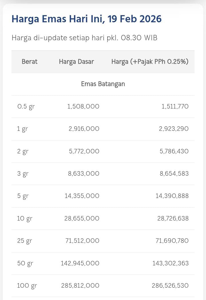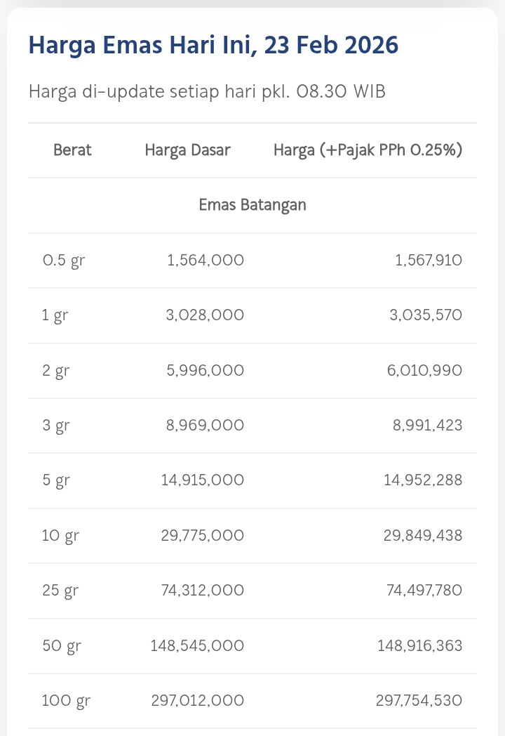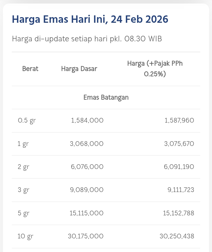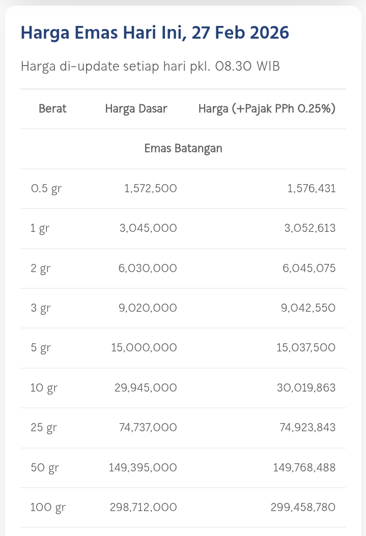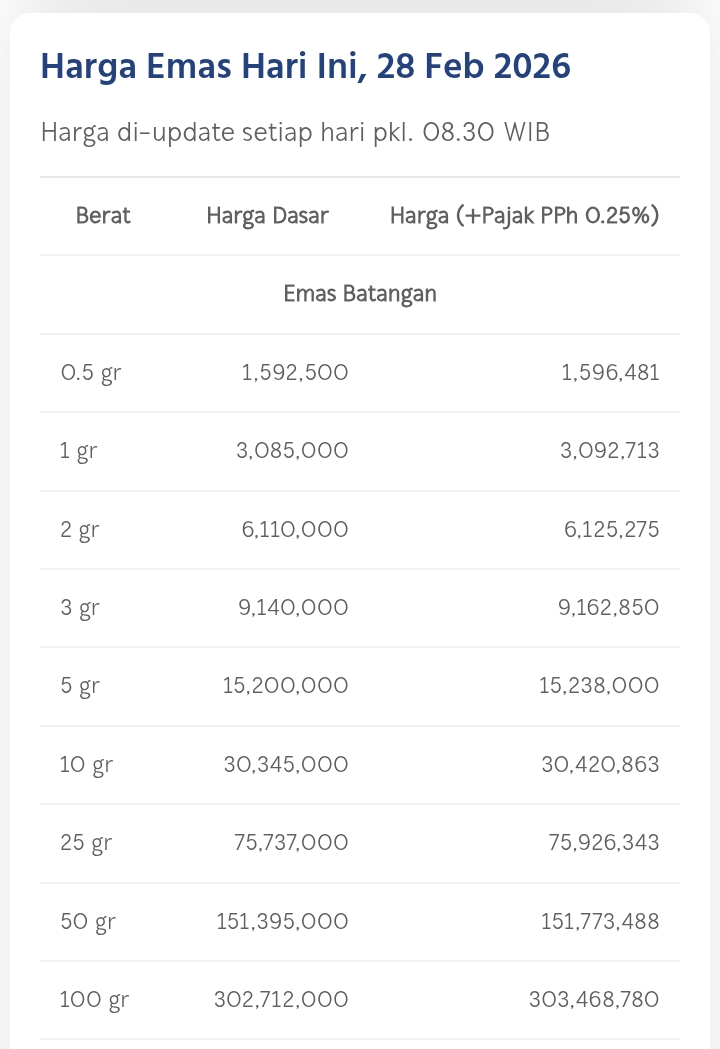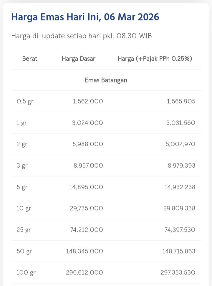 Emas Dunia Antam BSI Gold Galeri 24 Emasku Lotus Archi Grafik Cicil Harga Emas Hari Ini (Logam Mulia Antam) LM Antam (Logam Mulia Antam) adalah produk emas batangan dengan kadar kemurnian 99,99% yang diproduksi oleh PT Aneka Tambang Tbk (Antam). Ini adalah pilihan investasi emas paling populer dan terpercaya di Indonesia. Berapa harga emas Antam hari ini? Harganya ada di bawah ya. Harga emas berubah setiap hari, perubahannya di-update setiap jam 08.30 WIB. Beli emas Antam di sini Info Belanja Terlaris 1 di Shopee! Ini Dia Daftar Produknya Harga Emas Antam Tanggal 3 April 2026 ⬇️ Rp65.000 Harga Emas Antam Tanggal 28 Maret 2026 ⬆️ Rp27.000 Harga Emas Antam Tanggal 27 Maret 2026 ⬇️ Rp40.000 Harga Emas Antam Tanggal 26 Maret 2026 Harga Emas Antam Tanggal 25 Maret 2026 ⬆️ Rp7.000 Harga Emas Antam Tanggal 24 Maret 2026 Harga Emas Antam Tanggal 20 Maret 2026 ⬇️ Rp50.000 Harga Emas Antam Tanggal 19 Maret ⬇️ Rp53.000 Harga Emas Antam Tanggal 18 Maret ⬆️ Rp8.000 Harga Emas Antam Tanggal 17 Maret ⬇️ Rp4.000 Harga Emas Antam Tanggal 16 Maret ⬇️ Rp5.000 Harga Emas Antam Tanggal 14 Maret ⬇️ Rp24.000 Harga Emas Antam Tanggal 13 Maret ⬇️ Rp21.000 Harga Emas Antam Tanggal 12 Maret ⬇️ Rp45.000 Harga Emas Antam Tanggal 11 Maret ⬆️ Rp40.000 Harga Emas Antam Tanggal 10 Maret ⬆️ Rp8.000 Harga Emas Antam Tanggal 9 Maret ⬇️ Rp55.000 Harga Emas Antam Tanggal 7 Maret ⬆️ Rp35.000 Harga Emas Antam Tanggal 6 Maret ⬇️ Rp25.000 Harga Emas Antam Tanggal 5 Maret ⬆️ Rp4.000 Harga Emas Antam Tanggal 4 Maret ⬇️ Rp77.000 Harga Emas Antam Tanggal 3 Maret ⬇️ Rp13.000 Harga Emas Antam Tanggal 2 Maret ⬆️ Rp50.000 Harga Emas Antam Tanggal 28 Februari 2026 ⬆️ Rp40.000 Harga Emas Antam Tanggal 27 Februari 2026 ⬆️ Rp6.000 Harga Emas Antam Tanggal 26 Februari 2026 ⬆️ Rp16.000 Harga Emas Antam Tanggal 25 Februari 2026 ⬇️ Rp45.000 Harga Emas Antam Tanggal 24 Februari 2026 Rp40.000 Harga Emas Antam Tanggal 23 Februari 2026 ⬆️ Rp16.000 Harga Emas Antam Tanggal 21 Februari 2026 Harga Emas Antam Tanggal 20 Februari 2026 Harga Emas Antam Tanggal 19 Februari 2026 Antam Navigasi pos Investasi Perak Harganya Naik 476% dalam 10 Tahun Terakhir Lebih Tinggi dari Emas Cicilan Emas BSI Gold Hari Ini