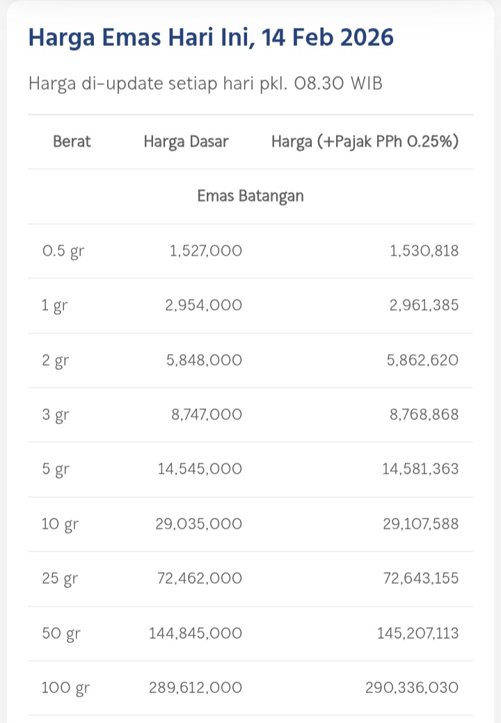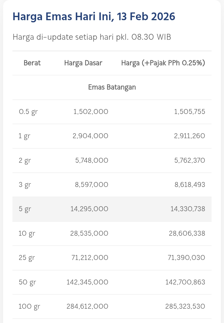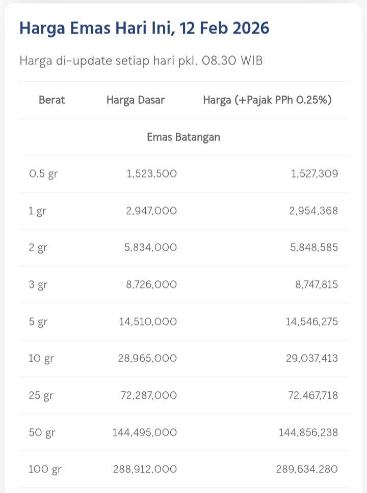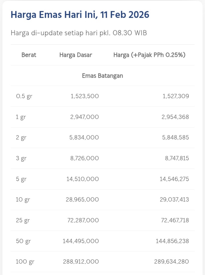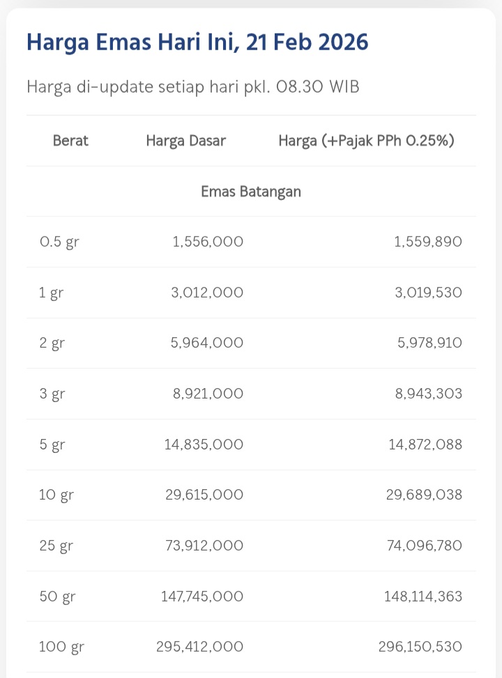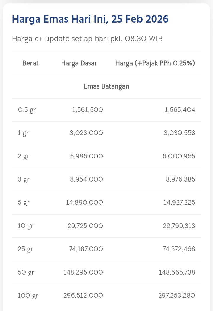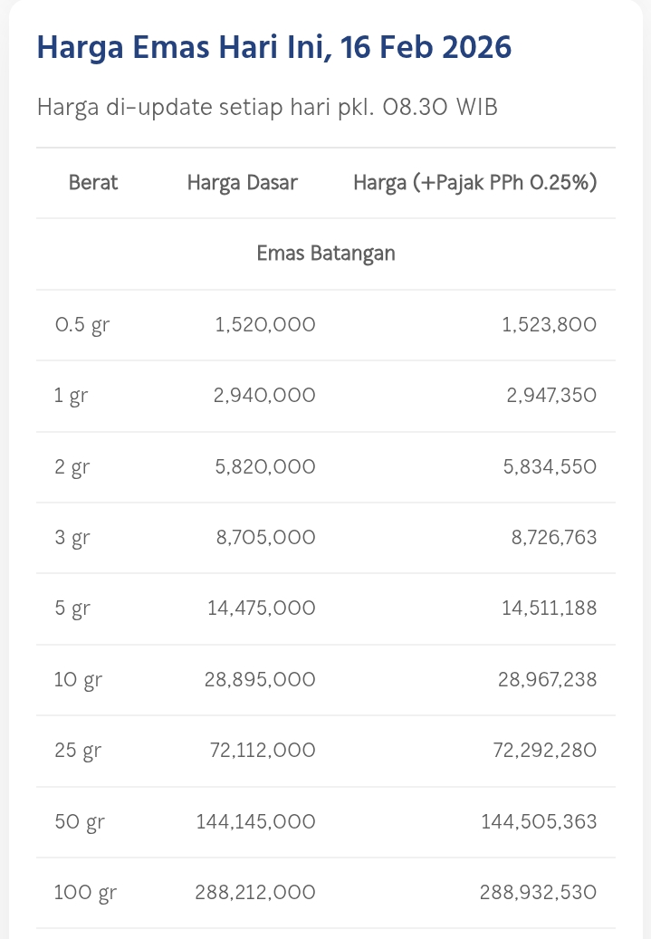 Emas Dunia Antam BSI Gold Galeri 24 Emasku Lotus Archi Grafik Cicil Harga Emas Hari Ini (Logam Mulia Antam) LM Antam (Logam Mulia Antam) adalah produk emas batangan dengan kadar kemurnian 99,99% yang diproduksi oleh PT Aneka Tambang Tbk (Antam). Ini adalah pilihan investasi emas paling populer dan terpercaya di Indonesia. Berapa harga emas Antam hari ini? Harganya ada di bawah ya. Harga emas berubah setiap hari, perubahannya di-update setiap jam 08.30 WIB. Beli emas Antam di sini Info Belanja Terlaris 1 di Shopee! Ini Dia Daftar Produknya Harga Emas Antam Tanggal 3 April 2026 ⬇️ Rp65.000 Harga Emas Antam Tanggal 28 Maret 2026 ⬆️ Rp27.000 Harga Emas Antam Tanggal 27 Maret 2026 ⬇️ Rp40.000 Harga Emas Antam Tanggal 26 Maret 2026 Harga Emas Antam Tanggal 25 Maret 2026 ⬆️ Rp7.000 Harga Emas Antam Tanggal 24 Maret 2026 Harga Emas Antam Tanggal 20 Maret 2026 ⬇️ Rp50.000 Harga Emas Antam Tanggal 19 Maret ⬇️ Rp53.000 Harga Emas Antam Tanggal 18 Maret ⬆️ Rp8.000 Harga Emas Antam Tanggal 17 Maret ⬇️ Rp4.000 Harga Emas Antam Tanggal 16 Maret ⬇️ Rp5.000 Harga Emas Antam Tanggal 14 Maret ⬇️ Rp24.000 Harga Emas Antam Tanggal 13 Maret ⬇️ Rp21.000 Harga Emas Antam Tanggal 12 Maret ⬇️ Rp45.000 Harga Emas Antam Tanggal 11 Maret ⬆️ Rp40.000 Harga Emas Antam Tanggal 10 Maret ⬆️ Rp8.000 Harga Emas Antam Tanggal 9 Maret ⬇️ Rp55.000 Harga Emas Antam Tanggal 7 Maret ⬆️ Rp35.000 Harga Emas Antam Tanggal 6 Maret ⬇️ Rp25.000 Harga Emas Antam Tanggal 5 Maret ⬆️ Rp4.000 Harga Emas Antam Tanggal 4 Maret ⬇️ Rp77.000 Harga Emas Antam Tanggal 3 Maret ⬇️ Rp13.000 Harga Emas Antam Tanggal 2 Maret ⬆️ Rp50.000 Harga Emas Antam Tanggal 28 Februari 2026 ⬆️ Rp40.000 Harga Emas Antam Tanggal 27 Februari 2026 ⬆️ Rp6.000 Harga Emas Antam Tanggal 26 Februari 2026 ⬆️ Rp16.000 Harga Emas Antam Tanggal 25 Februari 2026 ⬇️ Rp45.000 Harga Emas Antam Tanggal 24 Februari 2026 Rp40.000 Harga Emas Antam Tanggal 23 Februari 2026 ⬆️ Rp16.000 Harga Emas Antam Tanggal 21 Februari 2026 Harga Emas Antam Tanggal 20 Februari 2026 Harga Emas Antam Tanggal 19 Februari 2026 Antam Navigasi pos Investasi Perak Harganya Naik 476% dalam 10 Tahun Terakhir Lebih Tinggi dari Emas Cicilan Emas BSI Gold Hari Ini