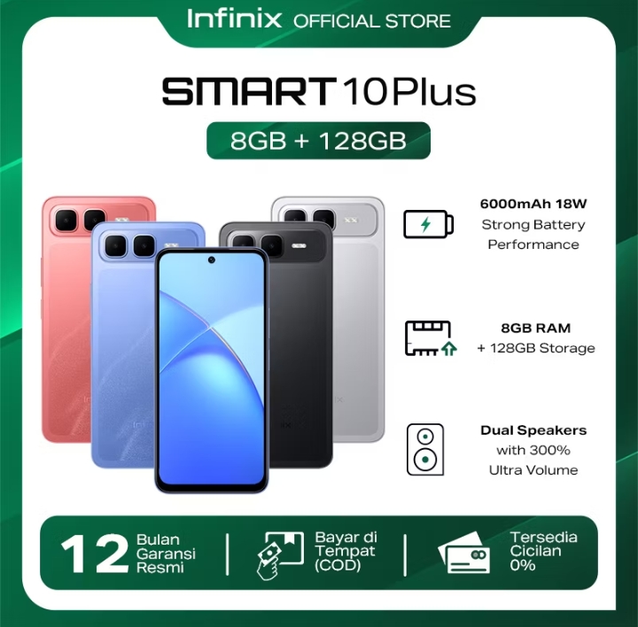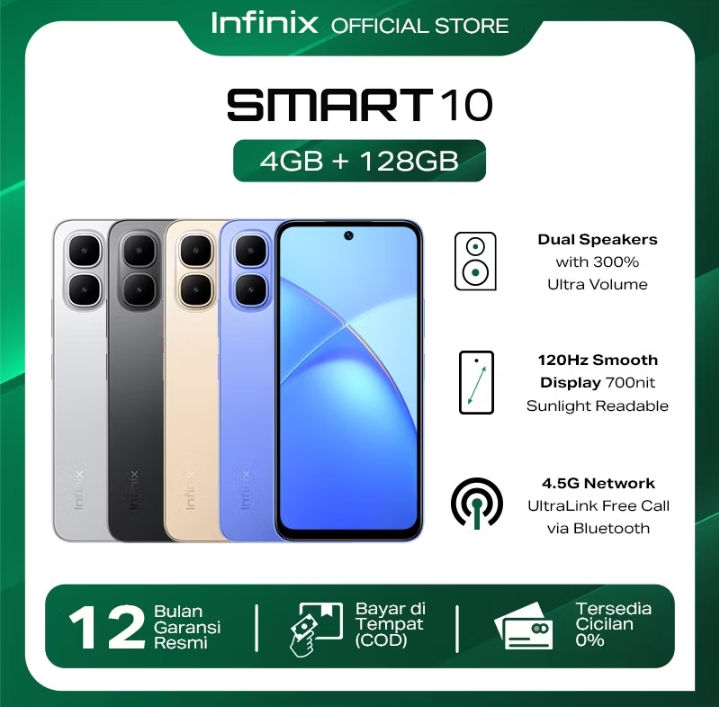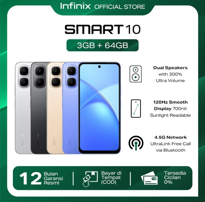 Rp136.000 per bulan – Infinix Smart 10 4/128GB Up to 8GB Extended RAM – 6.67 inch 120Hz HD+ – T7250 – 5000 mAh Rp1.309.000