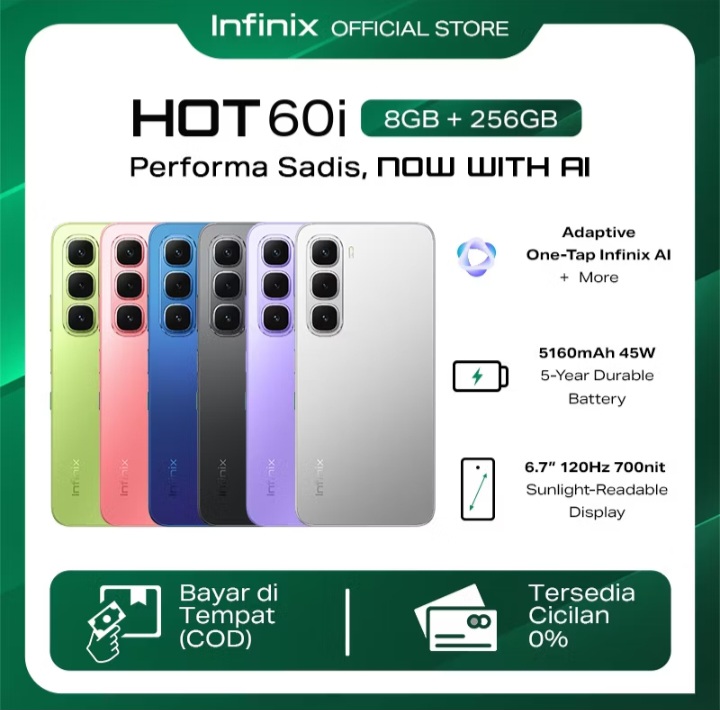 Rp214.000 per bulan – Infinix Hot 60i 8/256GB Up to 16GB Extended RAM – Helio G81 – 6.7 inch 120Hz HD+ – 50MP – 5160 mAh – NFC Rp1.998.000