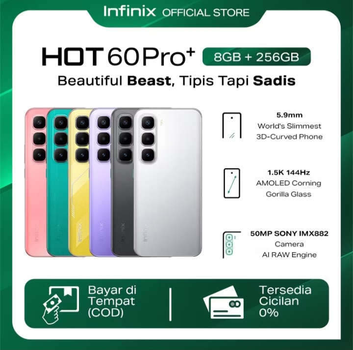 Rp308.000 per bulan – Infinix Hot 60 Pro+ 8/256GB Up to 16GB Extended RAM – Helio G200 – 6.78 inch 1.5k AMOLED – 50MP – 5160 mAh – NFC Rp2.849.000