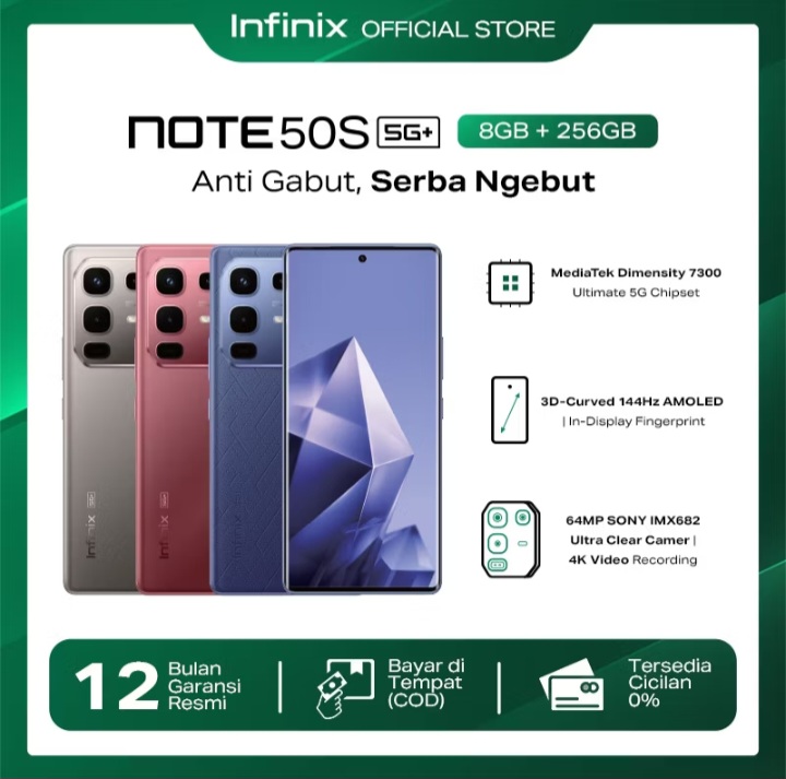 Rp339.000 per bulan – Infinix Note 50S 5G+ 8/256GB Up to 16GB Extended RAM – Dimensity 7300 Ultimate – 6.78” 3D Curved FHD+ Amoled – 64MP OIS – 5200 mAh – NFC Rp3.119.000