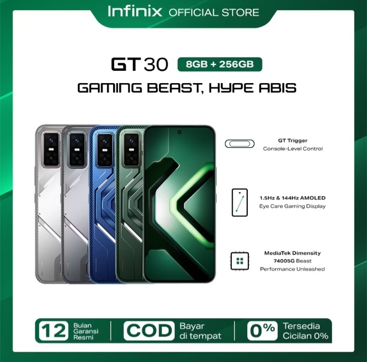 Rp430.000 per bulan – Infinix GT 30 Pro 8/256GB Up to 16GB Extended RAM – Dimensity 8350 Ultimate – 6.78″ Amoled+ 144Hz – 108MP – NFC Rp3.979.000