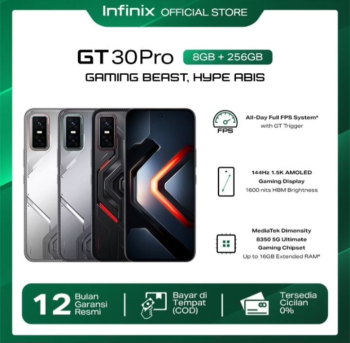 Rp498.000 per Bulan – Infinix GT 30 Pro 12/512GB Up to 24GB Extended RAM – Dimensity 8350 Ultimate – 6.78″ Amoled+ 144Hz – 108MP – NFC Rp4.599.000