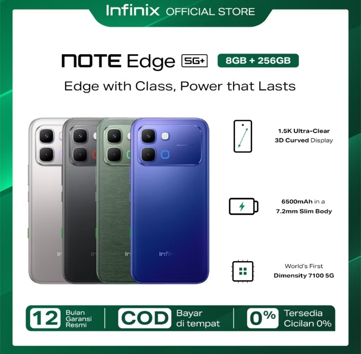 Rp373.000 per bulan – Infinix Note Edge 5G+ 8/256GB Up to 16GB Extended RAM – Dimensity 7100 5G – 6.78” 3D Curved Amoled – 50MP – 6500 mAh – NFC Rp3.449.000