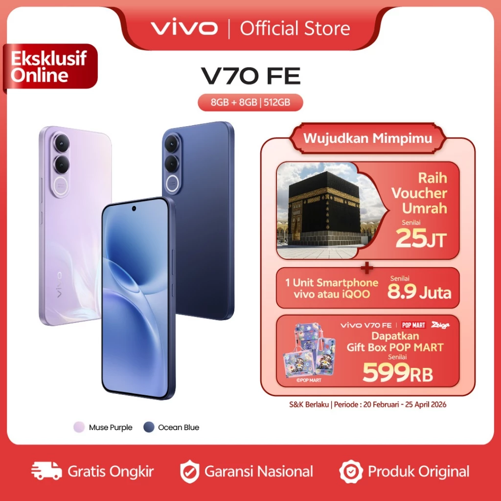 Vivo V70 FE: Baru rilis April 2026 dengan layar AMOLED 120Hz yang sangat terang (1900 nits) dan baterai jumbo 7.000mAh.