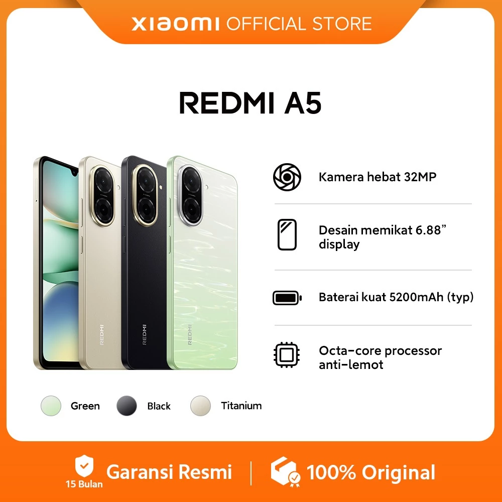 6. Xiaomi Redmi A5 (4+4GB*/128GB) Kamera hebat 32MP Desain memikat 6.88″display Baterai kuat 5200mAh Rp1.599.000
