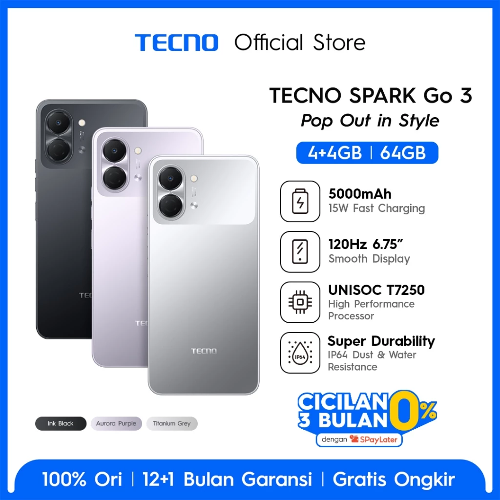 5. TECNO SPARK Go 3 4GB+4GB*/64GB, IP64, 6.75″ HD+, 120Hz Smooth Display, 5000mAh, 15W* Charging, Freelink Communication, TECNO AI Rp1.549.000