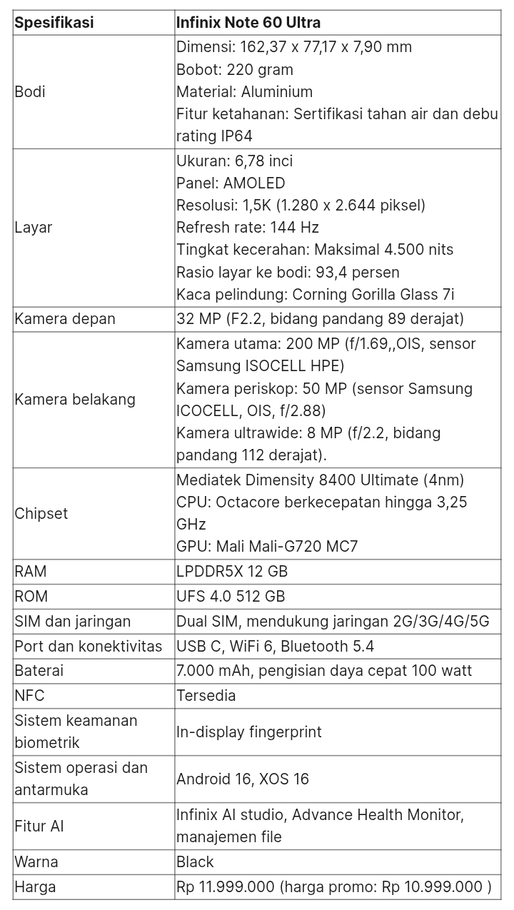 Untuk memudahkan membaca semua ulasan di atas, pengguna bisa melihat tabel spesifikasi dan harga Infinix Note 60 Ultra di bawah ini.