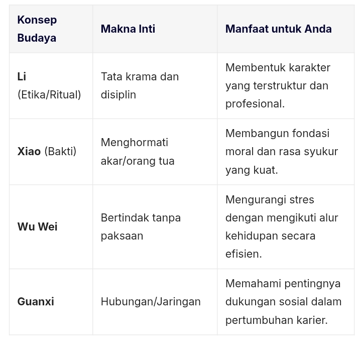 Terlaris 1 di Shopee! Belajar dari Leluhur: 5 Nilai Utama Budaya Cina untuk Meningkatkan Kualitas Diri dan Karier Budaya Cina memiliki kekayaan filosofis yang telah bertahan selama ribuan tahun. Nilai-nilai ini bukan sekadar tradisi kuno, melainkan perangkat praktis yang sangat relevan untuk pengembangan diri di era modern yang serba cepat. Berikut adalah pembahasan mendalam mengenai nilai-nilai utama budaya Cina yang dapat Anda terapkan untuk meningkatkan kualitas diri. Info Belanja Cicilan Online Murah Motor HP Laptop TV Mesin Cuci Kompor Gas Springbed Dll 1. Konsep Kēyǐ (Dapat Dilakukan) dan Ketekunan Dalam budaya Cina, kesuksesan jarang dilihat sebagai hasil dari bakat murni, melainkan hasil dari Chīkǔ (memakan kepahitan). Ini adalah kemampuan untuk bertahan melewati kesulitan demi tujuan jangka panjang. Penerapan Diri: Jangan mencari jalan pintas. Pengembangan diri adalah proses akumulasi. Jika Anda menghadapi kegagalan, lihat itu sebagai “investasi” dalam ketahanan mental Anda. Filosofi: “Perjalanan seribu mil dimulai dengan satu langkah kaki.” (Lao Tzu). Kěyǐ 可以 : Seni Mengizinkan Diri untuk Tumbuh Tanpa Batas 2. Rén (Kebajikan) dan Kecerdasan Emosional Rén adalah inti dari ajaran Konfusius, yang berarti rasa kemanusiaan atau cinta kasih. Dalam konteks pengembangan diri, ini berkaitan dengan bagaimana kita berinteraksi dengan orang lain dan diri sendiri. Penerapan Diri: Kembangkan empati. Kesuksesan pribadi yang tidak membawa manfaat bagi orang di sekitar cenderung terasa hampa. Menjadi pemimpin yang baik dimulai dengan menjadi manusia yang memiliki Rén. Rén 仁 : Mengasah Karakter Melalui Kepedulian Terhadap Sesama 3. Zhōngyòng (Doktrin Jalan Tengah) Dunia modern sering mendorong kita ke arah ekstrem—bekerja terlalu keras hingga burnout atau terlalu santai hingga stagnan. Budaya Cina mengajarkan Zhōngyòng, yaitu mencari keseimbangan dan menghindari ekstremitas. Penerapan Diri: Carilah moderasi dalam segala hal. Seimbangkan ambisi karier dengan kesehatan fisik, serta antara pembelajaran intelektual dengan ketenangan batin. Zhōngyòng 中庸 : Rahasia Hidup Harmonis Lewat Jalan Tengah 4. Wèi Lái (Perencanaan Masa Depan) Budaya Cina sangat menekankan pandangan jangka panjang (long-term orientation). Hal ini tercermin dalam budaya menabung dan investasi pada pendidikan anak-anak. Penerapan Diri: Berhentilah mengejar instant gratification. Buatlah rencana pengembangan diri untuk 5 atau 10 tahun ke depan. Apa keterampilan yang Anda pelajari hari ini yang akan tetap relevan satu dekade lagi? Wèi Lái 未来 : Membangun Masa Depan Melalui Langkah Hari Ini Tabel Ringkasan Nilai Budaya & Manfaat Pengembangan Diri 5. Wǔ Wéi (Tindakan Tanpa Upaya) Berasal dari Taoisme, Wu Wei bukan berarti malas, melainkan bertindak selaras dengan alam semesta (Tao). Ini adalah kondisi “flow” di mana Anda bekerja dengan efisiensi maksimal tanpa tekanan yang merusak. Penerapan Diri: Berhentilah melawan arus yang tidak bisa Anda kendalikan. Fokuskan energi Anda pada hal-hal yang memberikan dampak terbesar dengan hambatan terkecil. Belajarlah untuk “melepaskan” ego agar kreativitas bisa mengalir. Wu Wei: Seni Bertindak Tanpa Paksaan dalam Filosofi Taoisme Mengadopsi nilai-nilai budaya Cina berarti merangkul disiplin yang keras namun tetap menjaga harmoni batin. Pengembangan diri yang sejati bukanlah tentang menjadi yang tercepat, melainkan tentang memiliki ketahanan (Chīkǔ), keseimbangan (Zhōngyòng), dan integritas moral (Rén) yang tak tergoyahkan. Dengan mengintegrasikan kearifan Timur ini ke dalam gaya hidup modern, Anda tidak hanya berkembang secara profesional, tetapi juga mencapai kedamaian spiritual. Yang lainnya dari Cina Belajar dari Leluhur: 5 Nilai Utama Budaya Cina untuk Meningkatkan Kualitas Diri dan Karier Kěyǐ 可以 : Seni Mengizinkan Diri untuk Tumbuh Tanpa Batas Rén 仁 : Mengasah Karakter Melalui Kepedulian Terhadap Sesama Zhōngyòng 中庸 : Rahasia Hidup Harmonis Lewat Jalan Tengah Wèi Lái 未来 : Membangun Masa Depan Melalui Langkah Hari Ini Wu Wei: Seni Bertindak Tanpa Paksaan dalam Filosofi Taoisme Yuǎn Jiàn 远见 : Seni Memandang Melampaui Cakrawala untuk Masa Depan yang Tangguh Rěn Nài 忍耐 : Seni Melatih Ketahanan dalam Menunggu Hasil yang Besar Tentang Taoisme Taoisme: Panduan Hidup Selaras dengan Alam di Tengah Dunia yang Serba Cepat Wu Wei: Seni Bertindak Tanpa Paksaan dalam Filosofi Taoisme Sanbao: Menemukan Kompas Etika Melalui Tiga Harta Karun Taoisme Mengenal ‘De’ : Rahasia Biar Punya Aura Tenang dan Hidup Nggak Ribet Rahasia Taoisme dalam Menghadapi Ketidakpastian: Mengenal Konsep Dài Mìng Ziran: Seni Hidup Santai Tanpa Beban Mental ala Taoisme Seni Menjadi Otentik di Dunia yang Serba Rumit – Filosofi Pu Pengembangan Diri Stoikisme : Seni Hidup Tenang dan Bahagia Tanpa Drama 7 Nilai Budaya Jepang 日本文化 yang Akan Mengubah Cara Anda Berjuang Menuju Sukses Belajar dari Leluhur: 5 Nilai Utama Budaya Cina untuk Meningkatkan Kualitas Diri dan Karier Taoisme: Panduan Hidup Selaras dengan Alam di Tengah Dunia yang Serba Cepat Lebih dari Sekadar Tangguh: 5 Pelajaran Hidup dari Rusia untuk Pengembangan Diri Navigasi pos Ikigai 生きがい : Kunci Hidup Bermakna di Tengah Dunia yang Ambisius Wabi-Sabi 侘寂 : Menemukan Keindahan dalam Ketidaksempurnaan
