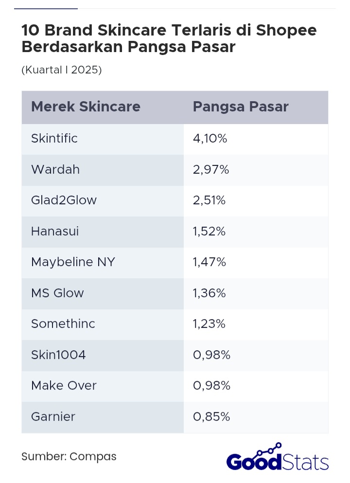 BELI DI SINI 10 Brand Skincare Terlaris di Shopee Indonesia, Mana Favoritmu? Pagi dimulai dengan mencuci wajah, malam diakhiri dengan rangkaian perawatan sebelum tidur. Tak peduli perempuan atau laki-laki, tua atau muda, skincare telah menjadi bagian dari gaya hidup masa kini. Perubahan ini tercermin jelas dalam tren belanja online. Shopee, sebagai salah satu platform e-commerce terbesar di Indonesia, mencatat lonjakan permintaan untuk produk perawatan dan kecantikan selama kuartal pertama 2025. Dari ribuan merek yang bersaing, ada sepuluh nama yang berhasil menempati posisi teratas berdasarkan analisa Compas untuk periode 1 Januari hingga 31 Maret 2025. 1. Skintific BELI DI SINI Skintific menempati posisi pertama dengan pangsa pasar sebesar 4,10%. Popularitas brand ini bukan datang tanpa alasan, formulasi produknya yang ramah untuk kulit sensitif hingga berjerawat membuatnya cepat mendapatkan tempat di hati konsumen. Banyak pengguna yang merasa “bertemu jodoh” dalam bentuk krim atau serum dari Skintific. Maka tak heran produk yang diiklankan oleh Nicholas Saputra ini jadi yang paling laris saat ini. 2. Wardah BELI DI TIKTOK DI SHOPEE Di belakangnya, Wardah tetap menunjukkan kekuatannya sebagai pionir skincare halal di Indonesia. Dengan pangsa pasar 2,97%, Wardah menjadi contoh nyata bagaimana brand lokal bisa bertahan di tengah gempuran merek baru. Formulanya yang ringan dan harga yang terjangkau menjadikannya pilihan yang bisa diandalkan siapa saja. 3. Glad2Glow BELI DI SINI Glad2Glow menyusul di posisi ketiga dengan 2,51%, sebuah kejutan menyenangkan dari brand yang mungkin belum sepopuler nama-nama besar lainnya, namun konsisten membangun basis penggemar yang loyal. 4. Hanasui BELI DI TIKTOK DI SHOPEE Hanasui dan Maybelline New York kemudian melengkapi lima besar, masing-masing dengan 1,52% dan 1,47%. 5. Maybelline New York BELI DI TIKTOK DI SHOPEE Maybelline New York adalah merek kosmetik nomor satu di dunia yang berasal dari Amerika Serikat dan berada di bawah naungan grup L’Oréal. Di Indonesia, Maybelline sangat populer karena menawarkan produk dengan inovasi terkini dan teknologi tahan lama (long-wearing) namun dengan harga yang tetap terjangkau. 6. MS Glow BELI DI TIKTOK DI SHOPEE MS Glow, Somethinc, Skin1004, Make Over, dan Garnier melengkapi daftar sepuluh besar. Angka pangsa pasarnya memang tak sebesar lima teratas, tapi kehadiran mereka tetap kuat di pasar, menunjukkan bahwa kebutuhan skincare masyarakat Indonesia sangat beragam, begitu pula preferensi mereka terhadap produk lokal maupun internasional. MS GLOW adalah merek kecantikan lokal asal Indonesia yang didirikan pada tahun 2013 oleh Shandy Purnamasari dan Maharani Kemala. Nama MS GLOW sendiri merupakan singkatan dari moto mereka, yaitu “Magic For Skin”. 7. Somethinc BELI DI TIKTOK DI SHOPEE Somethinc adalah merek kecantikan (skincare dan kosmetik) asal Indonesia yang diluncurkan pada tahun 2019. Merek ini sangat populer karena menghadirkan produk kualitas internasional dengan harga yang tetap terjangkau untuk pasar lokal. 8. Skin1004 BELI DI TIKTOK DI SHOPEE SKIN1004 (sering disebut sebagai “Skin Angel”) adalah merek perawatan kulit asal Korea Selatan yang terkenal karena penggunaan bahan-bahan alami yang minimalis. Fokus utama merek ini adalah Centella Asiatica yang dipanen secara liar dari Madagaskar, yang diklaim memiliki konsentrasi bahan aktif tujuh kali lebih tinggi dibandingkan sumber lainnya. 9. Make Over BELI DI TIKTOK DI SHOPEE Make Over adalah merek kosmetik profesional asal Indonesia di bawah naungan PT Paragon Technology and Innovation (satu grup dengan Wardah dan Emina). Diluncurkan pada tahun 2010, merek ini dikenal dengan citra eksklusif dominan hitam dan slogan “Beauty Beyond Rules”, yang mendorong kebebasan berekspresi melalui makeup. 10. Garnier BELI DI TIKTOK DI SHOPEE Garnier adalah merek kecantikan asal Prancis di bawah naungan L’Oréal yang sangat populer di Indonesia karena produknya yang menggunakan bahan alami, efektif, dan memiliki harga terjangkau. Merek ini menawarkan solusi lengkap mulai dari perawatan wajah, rambut, hingga pewarna rambut. Data ini sendiri dihimpun dari pemantauan terhadap 12.900 brand di kategori perawatan dan kecantikan. Compas mencatat penjualan dari toko resmi dan non-resmi di Shopee, dengan syarat hanya produk dengan rating minimal bintang empat yang dihitung. Artinya, daftar ini tidak hanya bicara soal jumlah pembeli, tetapi juga tingkat kepuasan mereka terhadap produk yang dipakai. Menariknya, empat dari sepuluh brand terlaris adalah produk lokal, yaitu Wardah, Hanasui, MS Glow, dan Somethinc. Ini menunjukkan bahwa kualitas buatan Indonesia tak kalah bersaing dengan brand luar. Dukungan konsumen yang makin percaya pada produk dalam negeri juga jadi penanda pergeseran besar dalam cara masyarakat memilih perawatan kulit. Kalau dilihat dari daftarnya, mungkin kamu pun pernah mencoba salah satu atau bahkan beberapa dari brand tersebut. Di tengah banyaknya pilihan, bukan tidak mungkin skincare favoritmu termasuk yang paling laris tahun ini. (goodstats) Navigasi pos Mengupas Isi “Buku Mantra Tes CPNS 2026-2027”: Senjata Ampuh Lolos Seleksi ASN Terlaris Online Elzanteri Jaket Parka Wanita Sharapova