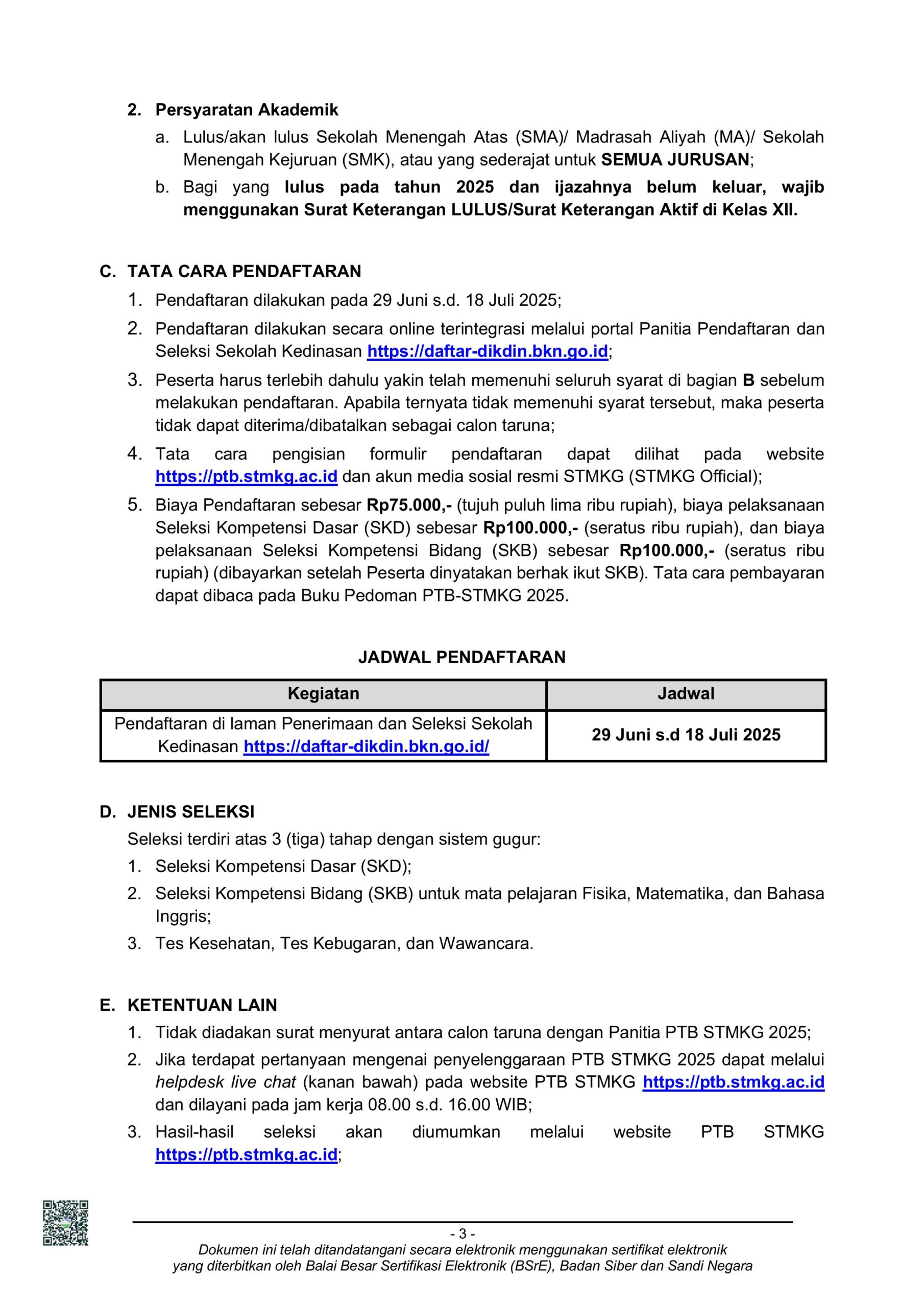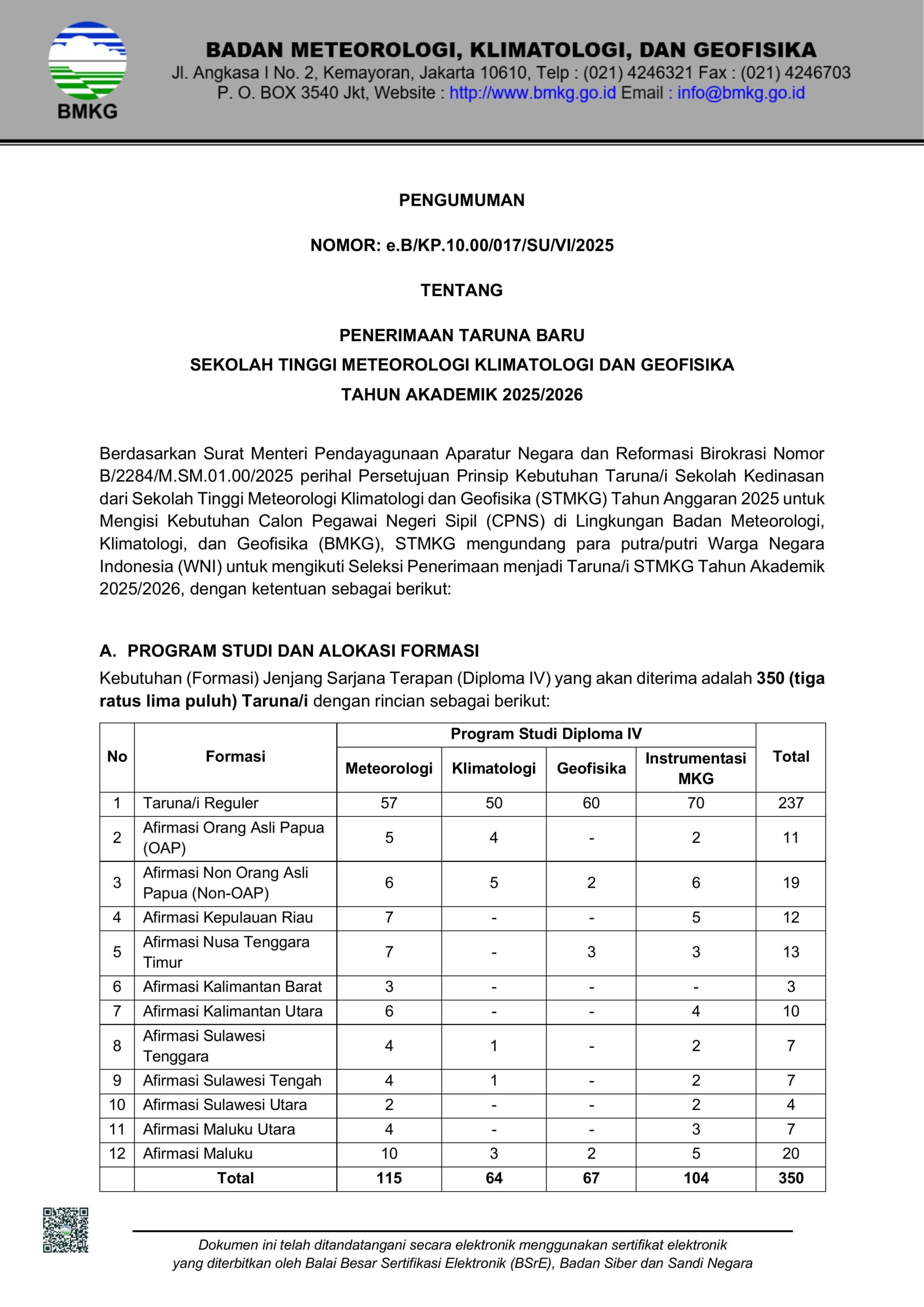 Syarat Lengkap Pendaftaran Sekolah Kedinasan STMKG STMKG (Sekolah Tinggi Meteorologi Klimatologi dan Geofisika) adalah perguruan tinggi kedinasan yang berada di bawah naungan Badan Meteorologi, Klimatologi, dan Geofisika (BMKG). Kampus ini bertujuan untuk mencetak tenaga ahli di bidang cuaca, iklim, gempa bumi, serta instrumentasi teknis terkait. Keunggulan & Status Lulusan Ikatan Dinas: Lulusan STMKG akan langsung diangkat menjadi Calon Pegawai Negeri Sipil (CPNS) di lingkungan BMKG dan ditempatkan di seluruh wilayah Indonesia. Biaya Pendidikan: Selama masa pendidikan, taruna/taruni tidak dipungut biaya pendidikan alias gratis. Gelar Akademik: Program pendidikan yang diselenggarakan adalah Diploma IV (D4) dengan gelar Sarjana Terapan. Info Kuliah Syarat Lengkap Pendaftaran 30 Sekolah Kedinasan IPDN STAN STIS STMKG STIN STIP STTD POLTEK SSN Dll Program Studi (Jurusan) STMKG memiliki empat program studi utama: Meteorologi: Fokus pada analisis dan prediksi cuaca. Klimatologi: Fokus pada analisis perubahan iklim. Geofisika: Fokus pada pengamatan gempa bumi, gravitasi, dan magnet bumi. Instrumentasi MKG: Fokus pada pemeliharaan dan pengembangan peralatan pengamatan BMKG. Info Belanja Cicilan Online Laptop HP Intel Core i3 UHD Rp744.930 Tahapan Seleksi Proses seleksi meliputi beberapa tahap ketat: Seleksi Administrasi Seleksi Kompetensi Dasar (SKD): Meliputi TWK, TIU, dan TKP. Seleksi Kompetensi Bidang (SKB): Tes Akademik mata pelajaran Fisika, Matematika, dan Bahasa Inggris. Tes Kesehatan, Kebugaran, dan Wawancara. Info Buku Buku Tes Terbaru 2026 : Tes CPNS, TNI POLRI, BUMN, Sekolah Kedinasan, UTBK SNBT Syarat Pendaftaran (2025) Download Syarat Daftar STMKG Yuk bagikan infonya di sosmed sahabat… Terima kasih Navigasi pos Syarat Lengkap Pendaftaran Politeknik Statistika STIS Syarat Lengkap Pendaftaran Poltek SSN Politeknik Siber dan Sandi Negara