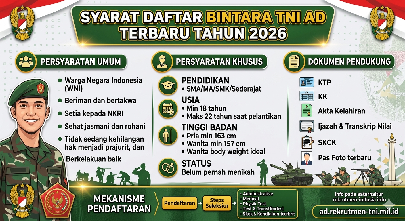 Buku Tes TNI POLRI Syarat Daftar Bintara TNI AD Terbaru Tahun 2026 Informasi ini untuk bahan persiapan tes Bintara TNI AD tahun depan ya, karena untuk tahun ini pendaftaran telah selesai dilaksanakan pada tanggal 7 Januari – 6 Februari 2026. Pendaftaran dilakukan secara online di website ad.rekrutmen-tni.mil.id. Syarat Pendaftaran Bintara TNI AD Persyaratan Umum Warga Negara Indonesia; Beriman dan bertaqwa kepada Tuhan Yang Maha Esa (menganut salah satu dari 6 agama yang diakui di Indonesia atau penghayat kepercayaan); Setia kepada Negara Kesatuan Republik Indonesia yang berdasarkan Pancasila dan Undang-Undang Dasar Negara Republik Indonesia tahun 1945; Berumur paling rendah 17 tahun 10 bulan dan paling tinggi 24 tahun 0 bulan pada saat pembukaan pendidikan pada 26 Maret 2026; Tidak memiliki catatan kriminalitas yang dikeluarkan secara tertulis oleh Kepolisian Republik Indonesia; Sehat jasmani dan rohani serta tidak berkacamata; dan Tidak sedang kehilangan hak menjadi prajurit berdasarkan putusan pengadilan yang telah memperoleh kekuatan hukum tetap. Info Buku Tes Buku Tes Terbaru 2026 : Tes CPNS, TNI POLRI, BUMN, Sekolah Kedinasan, UTBK SNBT Persyaratan Lain Pria, bukan anggota/mantan prajurit TNI/Polri atau PNS TNI; Berijazah S1/D4/D3/D1 tanpa persyaratan nilai atau lulusan SMA/MA/SMK sederajat baik negeri atau swasta yang terakreditasi (Berlaku Paket C) dengan persyaratan nilai rata-rata sebagai berikut: Lulusan SMA/MA/SMK tahun 2017 s.d. 2019 nilai minimal rata-rata Ujian Nasional adalah 37; Lulusan SMA/MA/SMK tahun 2020, nilai minimal rata-rata raport dari 3 mata pelajaran (Bahasa Indonesia, Bahasa Inggris dan Matematika) adalah 65; Lulusan SMA/MA/SMK tahun 2021 dan 2022, nilai minimal rata-rata raport dari 3 mata pelajaran (Bahasa Indonesia, Bahasa Inggris dan Matematika) adalah 68; dan Lulusan SMA/MA/SMK tahun 2023, 2024, dan 2025, nilai minimal rata-rata raport dari 3 mata pelajaran (Bahasa Indonesia, Bahasa Inggris dan Matematika) adalah 70. Belum pernah menikah dan sanggup tidak menikah selama dalam pendidikan pertama sampai dengan 2 (dua) tahun setelah selesai Dikma; Memiliki tinggi badan minimal 163 cm dan berat badan seimbang menurut ketentuan yang berlaku. Bersedia menjalani Ikatan Dinas Pertama (IDP) minimal selama 10 (sepuluh) tahun; Bersedia membayar sebanyak biaya yang telah dikeluarkan oleh negara menurut hukum dan peraturan yang berlaku apabila dengan kemauan sendiri menolak atau mengundurkan diri dari sebagian atau seluruh kegiatan penerimaan dan pendidikan pertama sampai dengan pengangkatan menjadi prajurit TNI; Bersedia ditempatkan dalam salah satu dari seluruh kecabangan yang ada di TNI AD serta bersedia ditempatkan di seluruh wilayah Negara Kesatuan Republik Indonesia; dan Harus mengikuti pemeriksaan/pengujian yang diselenggarakan oleh panitia penerimaan yang meliputi Administrasi, Kesehatan, Jasmani, Litpers dan Psikologi. Info Kuliah Syarat Lengkap Daftar Sekolah Kedinasan PKN STAN IPDN PTDI STTD STIN STMKG Dll Persyaratan Tambahan Persyaratan tambahan yang harus dipenuhi antara lain: Harus ada surat persetujuan orang tua/wali (dapat ditandatangani ibu kandung, apabila bapak kandung bekerja di luar daerah/Provinsi atau telah meninggal dunia/tidak diketahui keberadaannya dan ibu kandung tidak kawin lagi) dan selama proses penerimaan prajurit TNI AD orang tua/wali tidak melakukan intervensi terhadap panitia penerimaan maupun penyelenggara pendidikan pertama dalam bentuk apapun, kapanpun dan dimanapun; Orang yang ditunjuk sebagai wali dari yang bersangkutan berdasarkan penetapan pengadilan dan telah diproses Disdukcapil; Bagi yang memperoleh ijazah dari negara lain atau lembaga pendidikan di luar naungan Kemendikbud, harus mendapat pengesahan dari Kemendikbud dan transkrip nilai yag sudah disesuaikan dengan regulasi negara Indonesia; Tidak bertato/bekas tato dan tidak bertindik/bekas tindik, kecuali yang disebabkan oleh ketentuan adat (harus disertai surat keterangan dari ketua adat/suku); Bersedia mematuhi peraturan bebas KKN baik langsung maupun tidak langsung, apabila terbukti secara hukum melanggar sebagaimana yang dimaksud, maka harus bersedia dinyatakan tidak lulus dan atau dikeluarkan dari Dikma, jika pelanggaran tersebut ditemukan di kemudian hari pada saat mengikuti pendidikan pertama. Bentuk Surat Pernyataan tidak melakukan penyuapan; dan Memiliki kartu BPJS (Badan Peyelenggara Jaminan Sosial) atau KIS (Kartu Indonesia Sehat) aktif. Persyaratan Prestasi Diperbolehkan bagi calon Bintara PK TNI AD yang menyertakan sertifikat/piagam/surat keterangan prestasi minimal tingkat nasional dengan kriteria juara (juara 1, 2 dan 3) sebagai nilai tambah dalam pelaksanaan Rik/Uji dan sidang pemilihan. Seleksi Bintara TNI AD 2026 terbuka bagi lulusan SMA/MA/SMK hingga S-1. Khusus pelamar lulusan D1, D3, D4, atau S1, tidak diwajibkan melampirkan nilai ijazah jenjang SMA sederajat. Seluruh peserta juga harus bersedia ditempatkan di seluruh kecabangan dan wilayah. Proses seleksi dilakukan secara transparan, objektif, dan bebas dari pungutan biaya. Calon pelamar diimbau untuk waspada terhadap calo atau oknum penipuan yang menjanjikan kelulusan. Sumber : ad.rekrutmen-tni.mil.id Daftar Kedinasan TNI POLRI Syarat Lengkap Daftar Sekolah Kedinasan PKN STAN IPDN PTDI STTD STIN STMKG Dll Syarat Daftar AKPOL Terbaru Tahun 2026 Syarat Daftar Akademi TNI Terbaru Tahun 2026 Syarat Daftar Bintara POLRI Terbaru Tahun 2026 Syarat Daftar Bintara TNI AD Terbaru Tahun 2026 Navigasi pos Bimbel Sekolah Kedinasan PKN STAN IPDN STIS STTD Dll