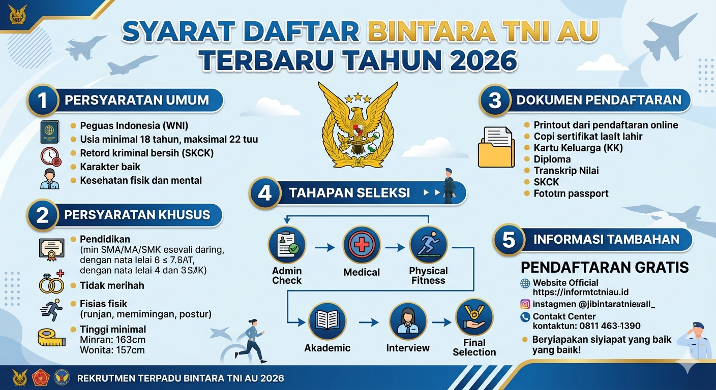 BUKU TES TNI POLRI Syarat Daftar Bintara TNI AU Terbaru Tahun 2026 Syarat Umum Warga negara Indonesia Beriman dan bertakwa kepada Tuhan Yang Maha Esa Setiap kepada NKRI dan Pancasila serta UUD 1945 Lulusan D3 berusia maksimal 25 tahun per 14 Maret 2026 Lulusan SMA/MA/SMK berusia minimal 19 tahun 9 bulan dan maksimal 22 tahun per 14 Maret 2026 Tidak memiliki catatan kriminalitas yang dikeluarkan secara tertulis oleh Kepolisian Negara Republik Indonesia Sehat secara jasmani dan rohani Tidak sedang kehilangan hak menjadi prajurit berdasarkan putusan pengadilan yang telah memperoleh kekuatan hukum tetap Lulus pendidikan pertama Syarat Khusus Calon Bintara PK pria bukan anggota/mantan TNI/Polri/PNS Calon Bintara PK pria berijazah D3 dengan keahlian bidang yang dapat dilihat lewat LINK INI Calon Bintara PK Pria berijazah SMA/MA jurusan IPA/Kurikulum Merdeka dan SMK dengan bidang jurusan yang bisa dilihat lewat LINK INI Bintara PK TNI AU pria gelombang 1 tahun 2026 tidak menerima lulusan/ijazah SMA/sederajat jurusan IPS Untuk calon Bintara PK pria lulusan SMA Angkasa dengan jurusan Airframe and Powerplant, Electrical Avionics, Aircraft Electricity, Aircraft Machining, Teknik Komputer dan Jaringan, Rekayasa Perangkat Lunak, dan Teknik Elektronika diberlakukan kekhususan (Panda Khusus). Daftar SMK yang diberlakukan Panda khusus bisa dilihat di LINK INI Khusus atlet berprestasi tingkat nasional atau internasional bisa melengkapi surat rekomendasi dari pembina cabang olahraga dari TNI AU dan calon yang direkomendasikan tokoh/pemuka agama/tokoh masyarakat/ketua suku harus dilengkapi surat persetujuan pejabat TNI AU terkait dapat berijazah SMA/MA jurusan IPS dan SMK semua jurusan Tinggi badan sekurang-kurangnya bagi calon Bintara PK pria 163 cm Bersedia menandatangani surat perjanjian ikatan dinas pertama keprajuritan selama 10 tahun Lulusan SMA/MA tahun 2021 dan 2022 tidak melampirkan SKHUN Mempunyai kartu BPJS/jaminan kesehatan yang aktif, dibuktikan dengan bukti kuitansi pembayaran terakhir Syarat Tambahan Bersedia ditempatkan di seluruh wilayah NKRI Sanggup mengganti biaya jika mengundurkan diri sebelum pendidikan pertama berakhir Sanggup mengganti biaya jika mengundurkan diri sebelum ikatan dinas pertama berakhi Mendapatkan tanda tangan orang tua/wali dalam surat pernyataan tidak melakukan penyuapan/kolusi terhadap pihak manapun Siap mengundurkan diri dari instansi tempat bekerja sebelumnya jika dinyatakan lolos Belum menikah dan sanggup tidak menikah selama mengikuri pendidikan pertama hingga 2 tahun setelah lulus pendidikan Mendapat persetujuan dari orang tua bagi calon siswa yang belum berumur 21 tahun Mengikuti dan lulus pemeriksaan/pengujian masuk Tidak buta warna, tidak memiliki riwayat TB paru aktif, tidak pernah melaksanakan terapi Ortho-K, maupun laparotomy dengan komplikasi Bedah refraksi diperbolehkan jika memakai metode PRK, Lasik, dan Relex Smile dengan batas refraksi sebelum operasi 5 Dioptri, setelah operasi tajam penglihatan 1.0 atau visus 6/6 atau koreksi maksimal 0,5 Dioptri Tindakan operasi maksimal dilakukan tiga bulan sebelum seleksi Cara Daftar Calon Bintara PK TNI AU Melakukan pendaftaran lewat website https://diajurit.tni-au.mil.id Melakukan verifikasi casis hadir/daftar ulang di panda-panda untuk memerika keabsahan syarat. Daftar panda dapat dilihat pada LINK INI Calon dinyatakan lulus dan terpilih menjadi calon prajurit akan langsung mengikuti pendidikan dasar keprajuritan di Skadik 402 Wingdik 40/Matukjur Pusdik Kodiklatau. Pendaftaran Bintara TNI AU periode sebelumnya, yaitu gelombang 1 sudah dilaksanakan pada bulan Desember 2025. Kapan pendaftaran gelombang 2 dibuka? Estimasi pendaftaran dibuka pada bulan Mei – Juni 2026. Kunjungi diajurit.tni-au.mil.id untuk informasi terbarunya. *** Daftar Kedinasan TNI POLRI Syarat Lengkap Daftar Sekolah Kedinasan PKN STAN IPDN PTDI STTD STIN STMKG Dll Syarat Daftar AKPOL Terbaru Tahun 2026 Syarat Daftar Akademi TNI Terbaru Tahun 2026 Syarat Daftar Bintara POLRI Terbaru Tahun 2026 Syarat Daftar Bintara TNI AD Terbaru Tahun 2026 Syarat Daftar Bintara TNI AL Terbaru Tahun 2026 Syarat Daftar Bintara TNI AU Terbaru Tahun 2026 Navigasi pos Syarat Daftar Bintara TNI AD Terbaru Tahun 2026 Pendaftaran Bintara TNI AL Gelombang III Dibuka Tanggal 7 April – 30 Juli 2026