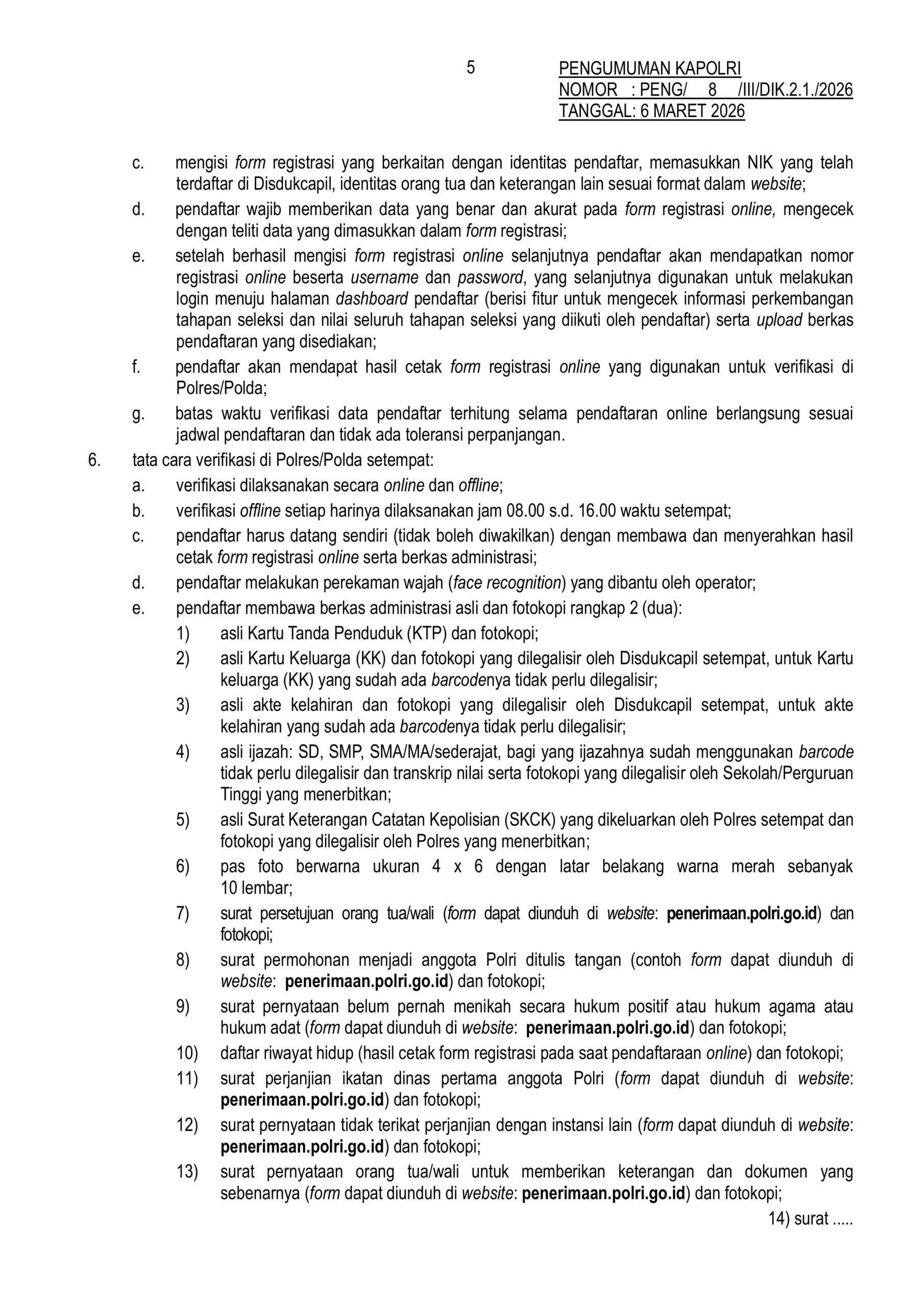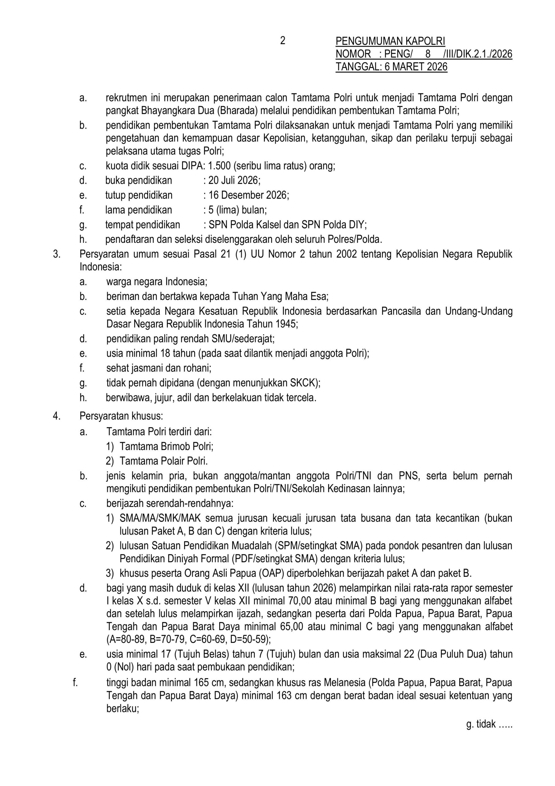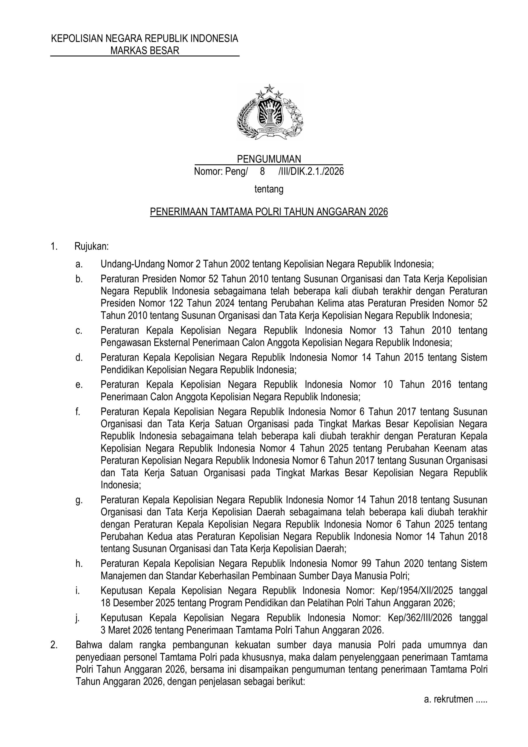 BELI BUKU TES POLRI 2026 Pendaftaran Tamtama POLRI Resmi Dibuka Tanggal 9-30 Maret 2026 Kepolisian Negara Republik Indonesia (POLRI) resmi membuka pendaftaran AKPOL, Bintara dan Tamtama tahun 2026 pada tanggal 9-30 Maret 2026. Informasi ini dirilis dalam website resmi penerimaan POLRI penerimaan.polri.go.id Info Belanja Terlaris 1 di Shopee! Ini Dia Daftar Produknya DOWNLOAD Navigasi pos Pendaftaran Bintara POLRI Resmi Dibuka Tanggal 9-30 Maret 2026 Program Magang ke Jepang 2026 Dibuka, Ini Syarat, Jadwal, dan Benefitnya